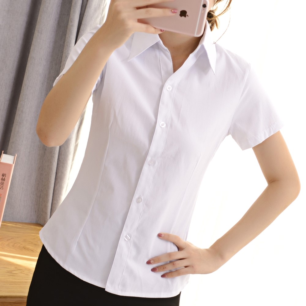 胖mm女夏季浅蓝长袖白色短款衬衫修身显瘦大码棉气质职业工服宽松