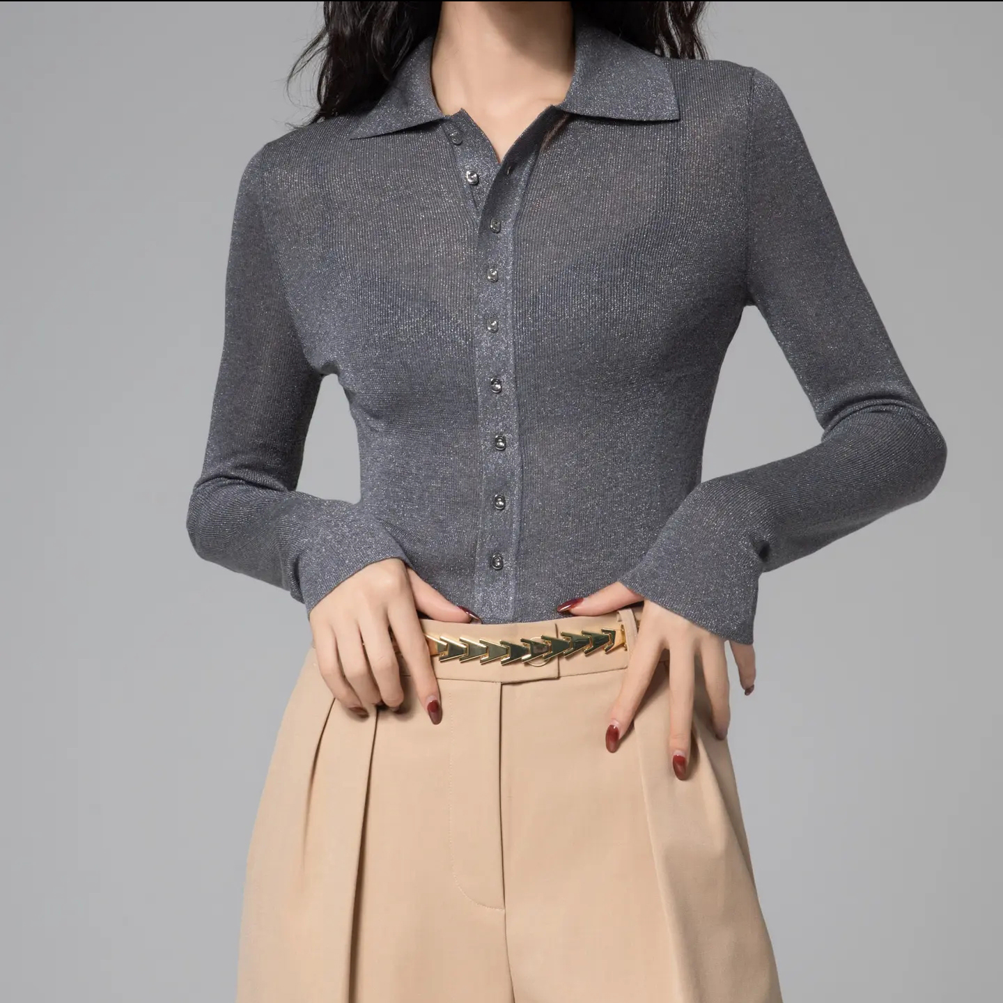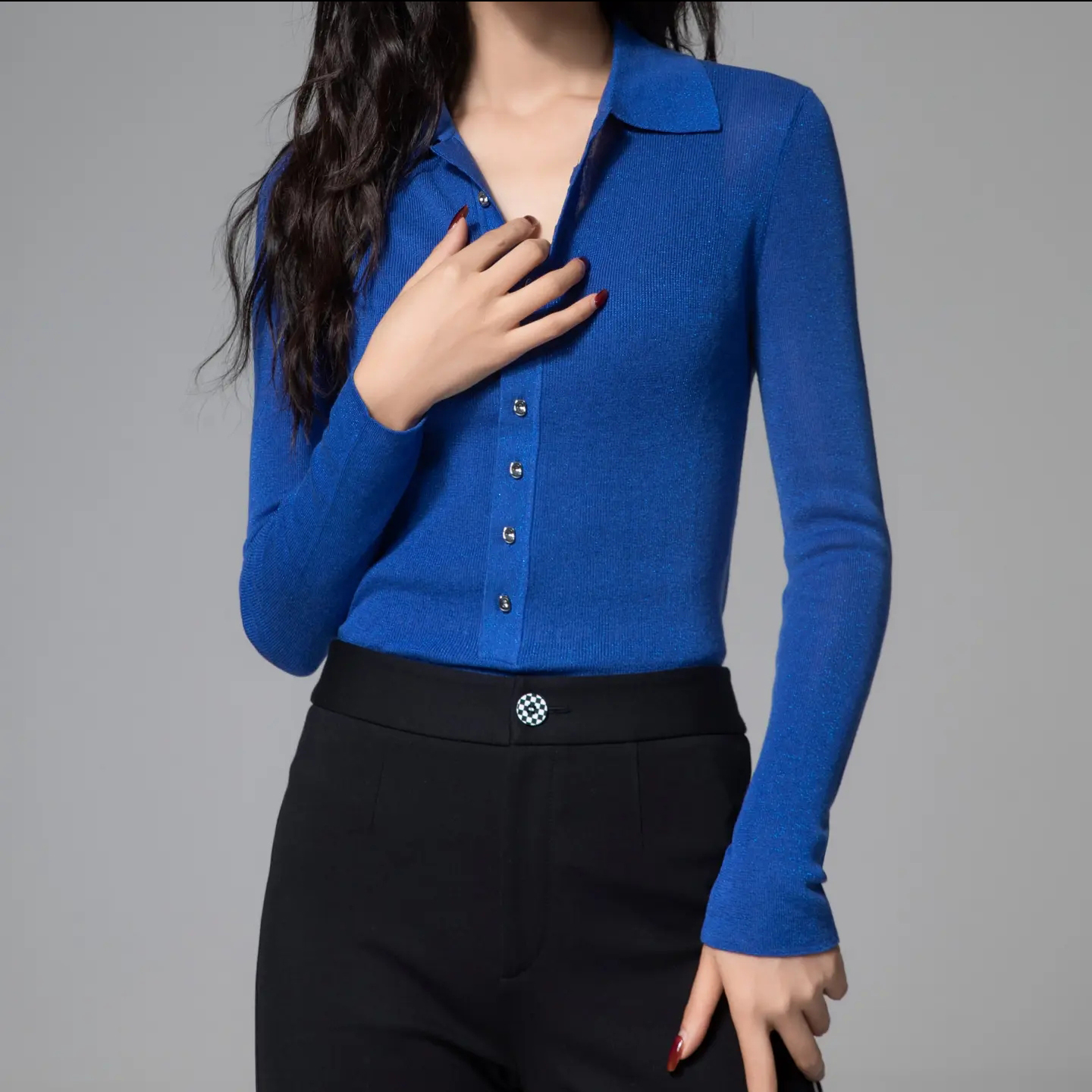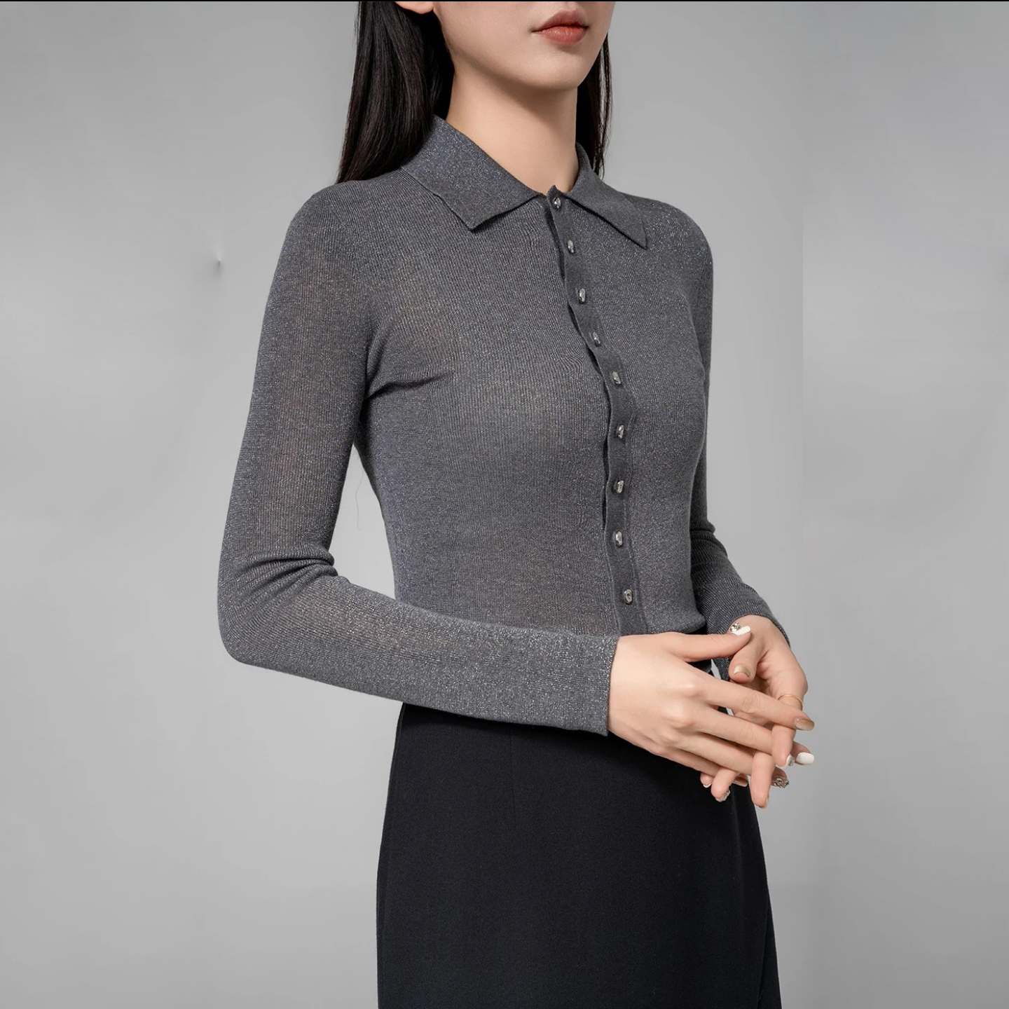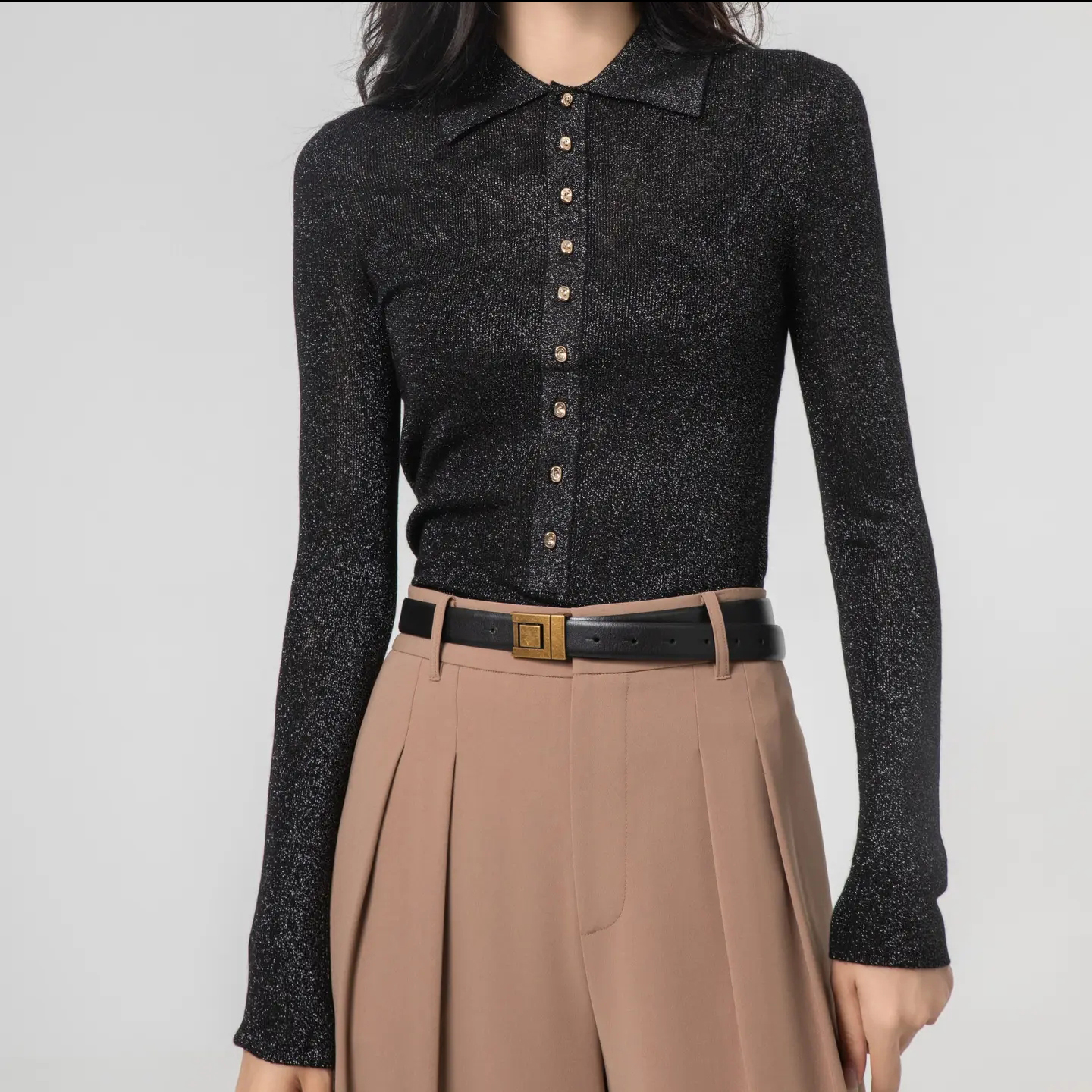 阿玛施2024秋季新款百搭翻领细闪修身显瘦黑色衬衫女5399662