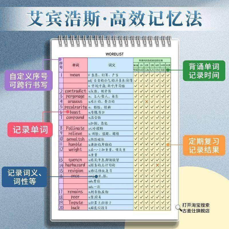 艾宾浩斯遗忘曲线记忆英语单字本初高中大学生四六级备考默写神器随身可携式考研高中初中简约横线记忆本记事