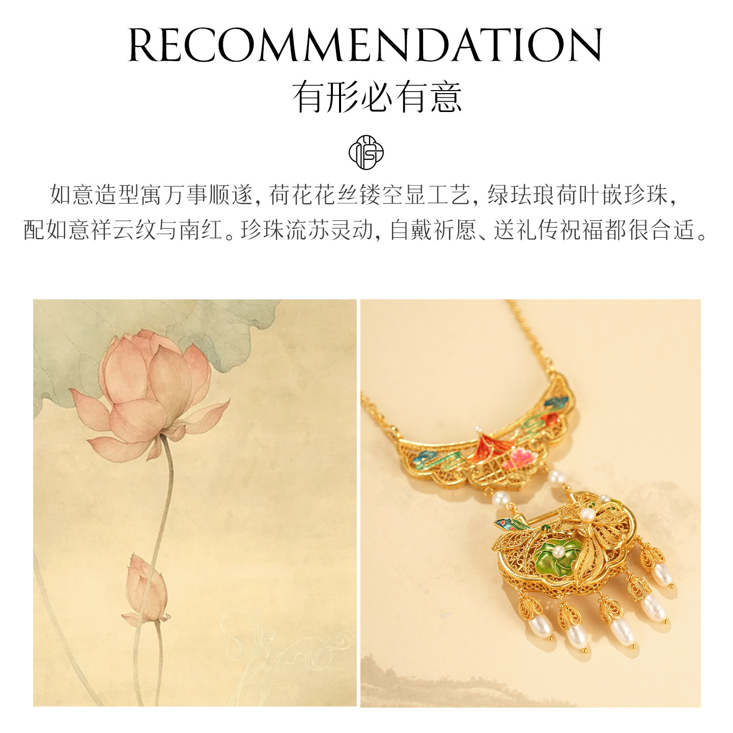 莲花珍珠银鎏金项链非遗花丝镂空珐琅荷花新中式长命锁平安锁项坠