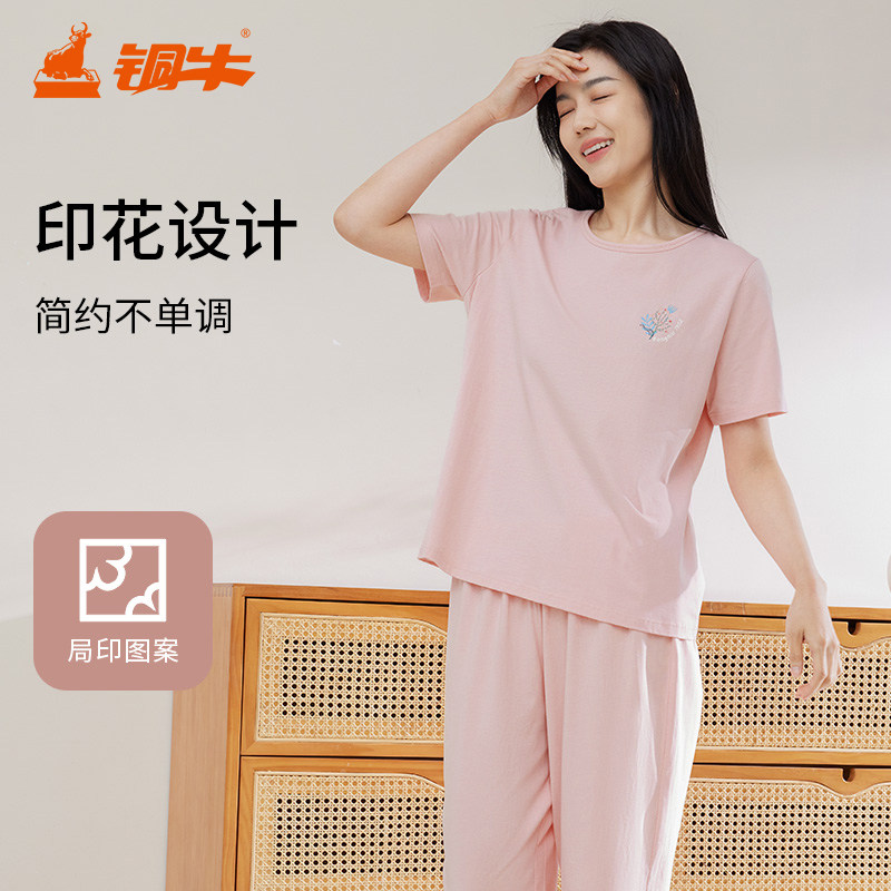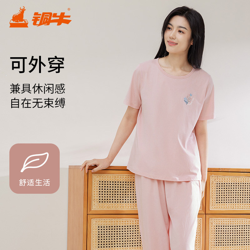 铜牛韶棉半袖V领圆领男女家居服 春夏纯棉睡衣套装NJ055