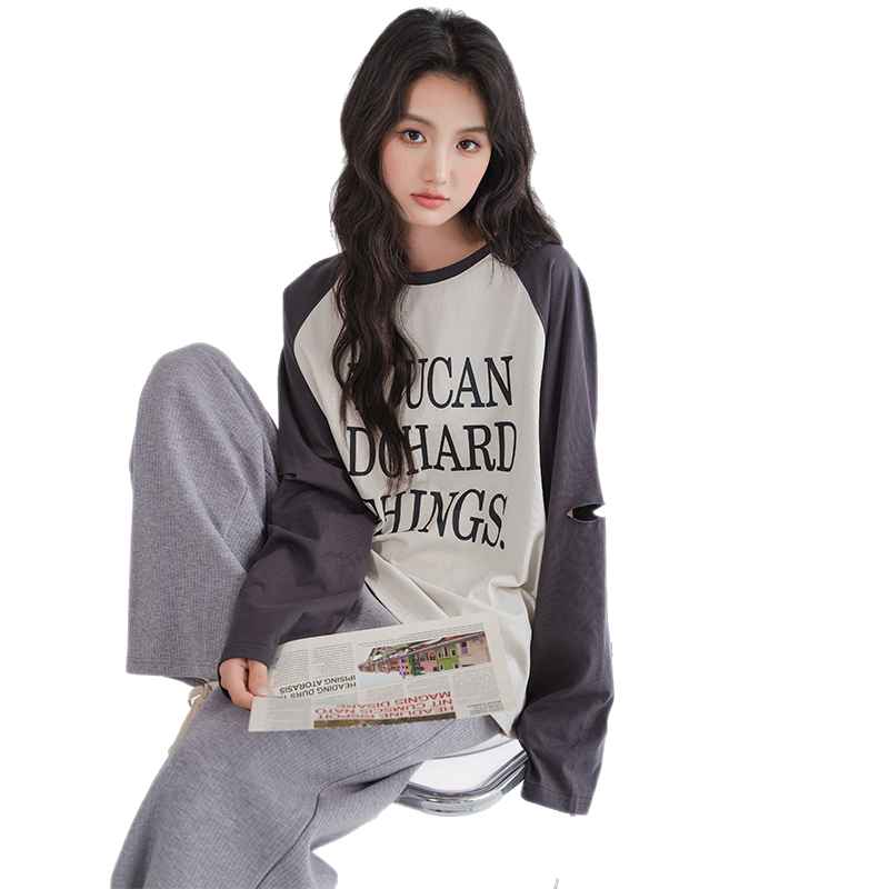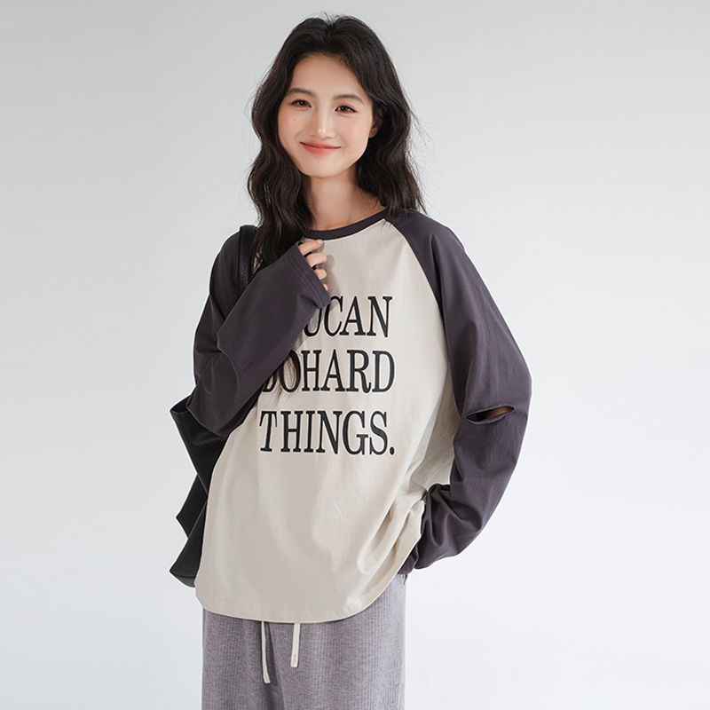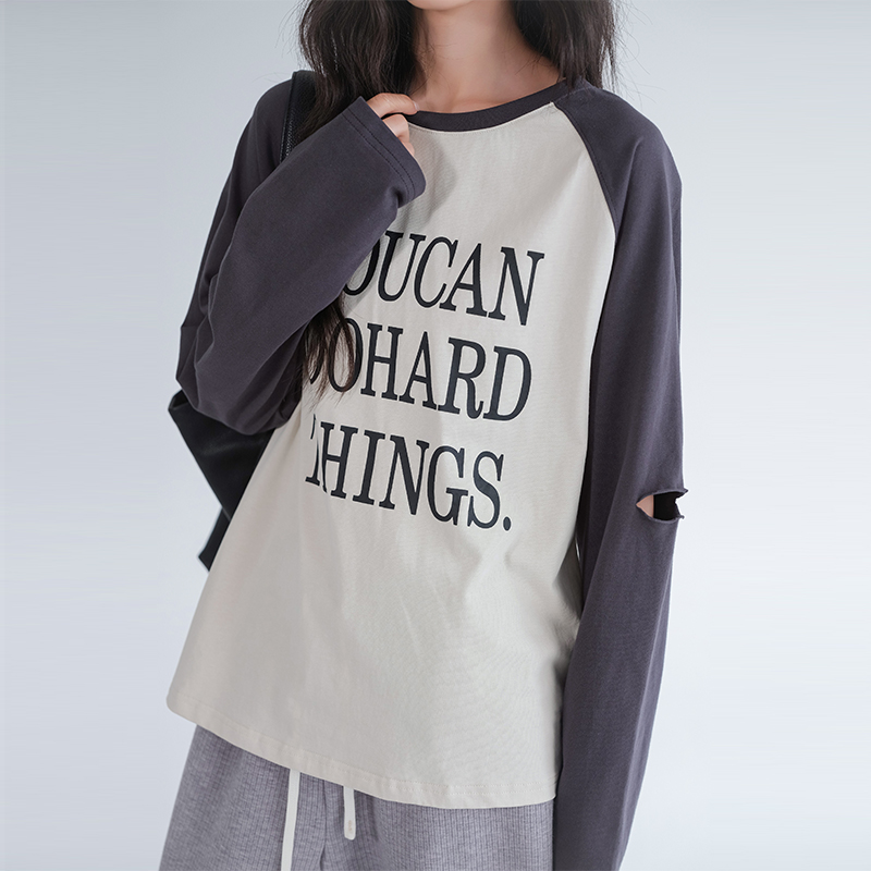 蓝若水大码女装胖MM破洞插肩长袖T恤2025秋装新款时尚印花打底衫
