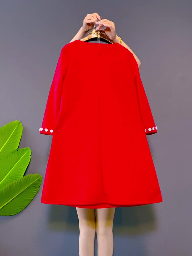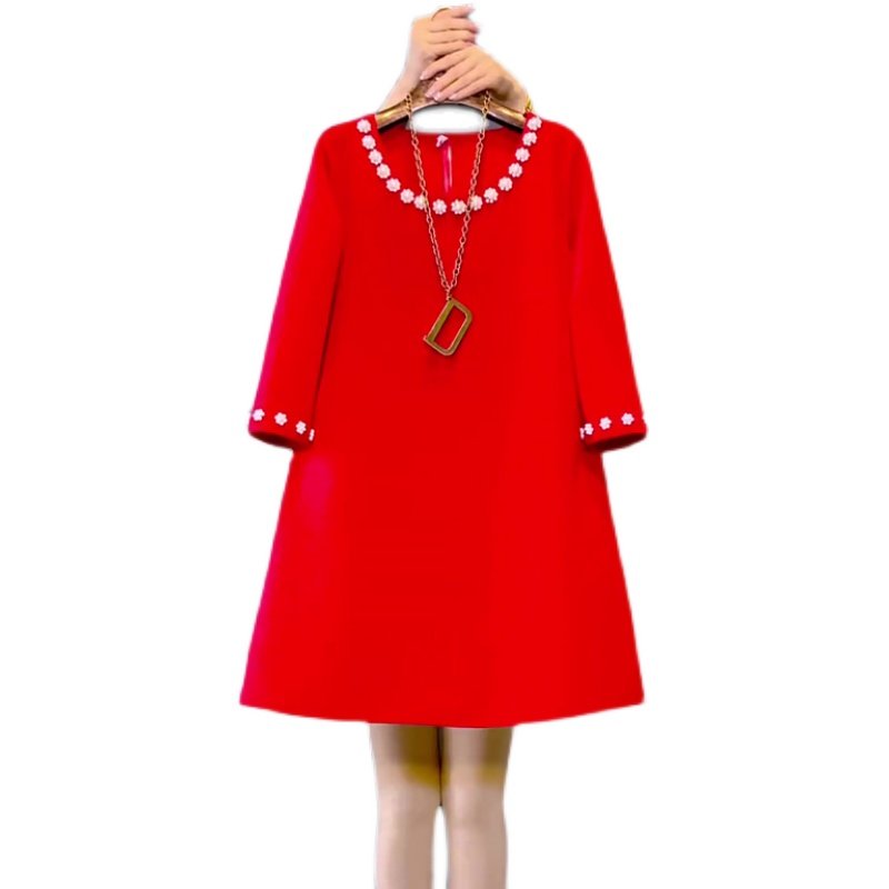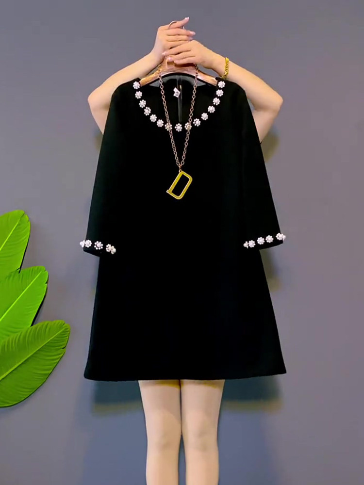 胖妹妹春季新款大码女装珍珠花朵圆领七分袖连衣裙时尚洋气裙子潮