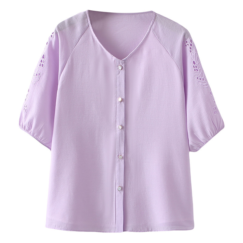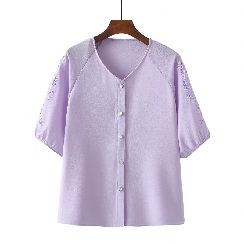 大码女装新款韩版休闲上衣夏季宽松显瘦胖mm镂空刺绣短袖雪纺衬衫