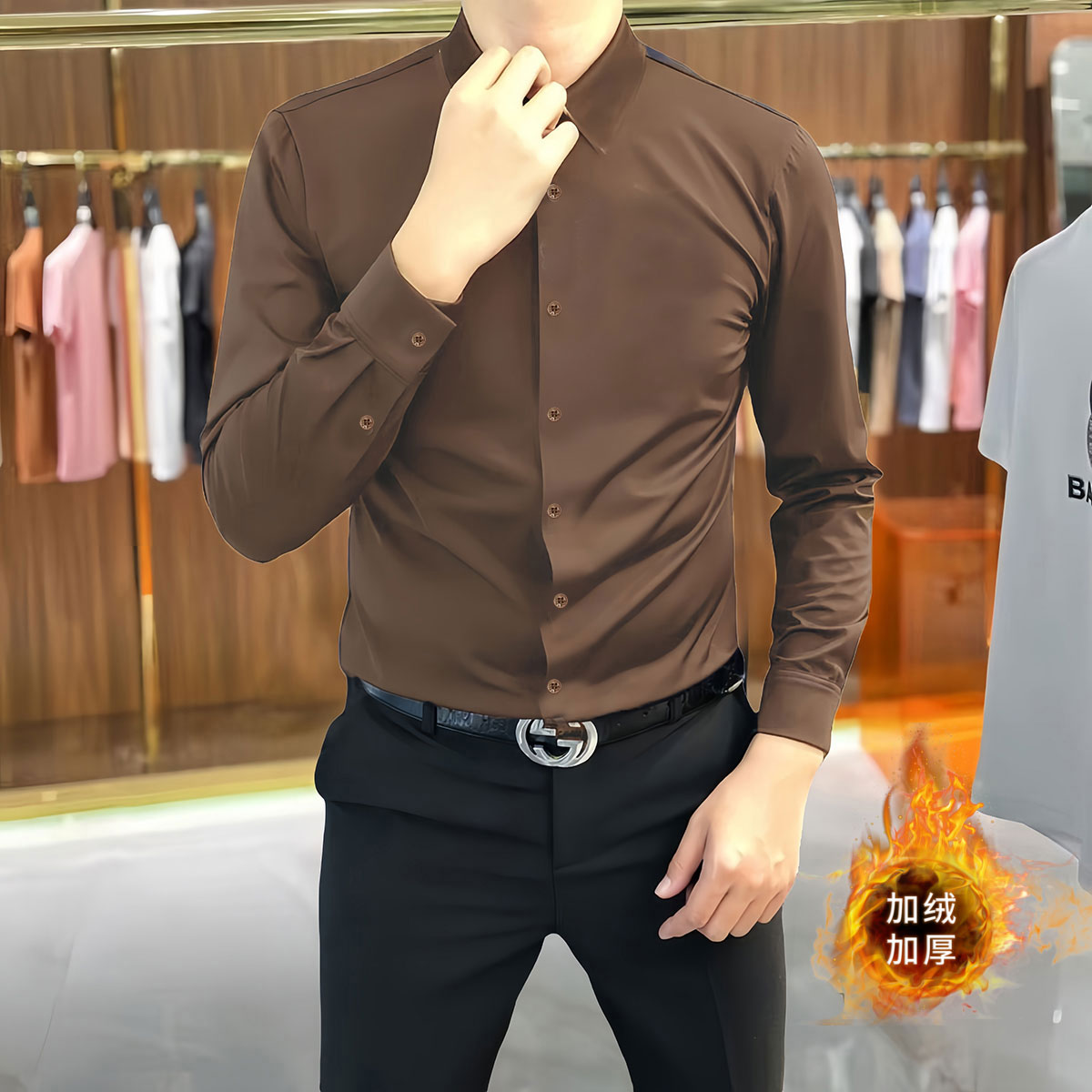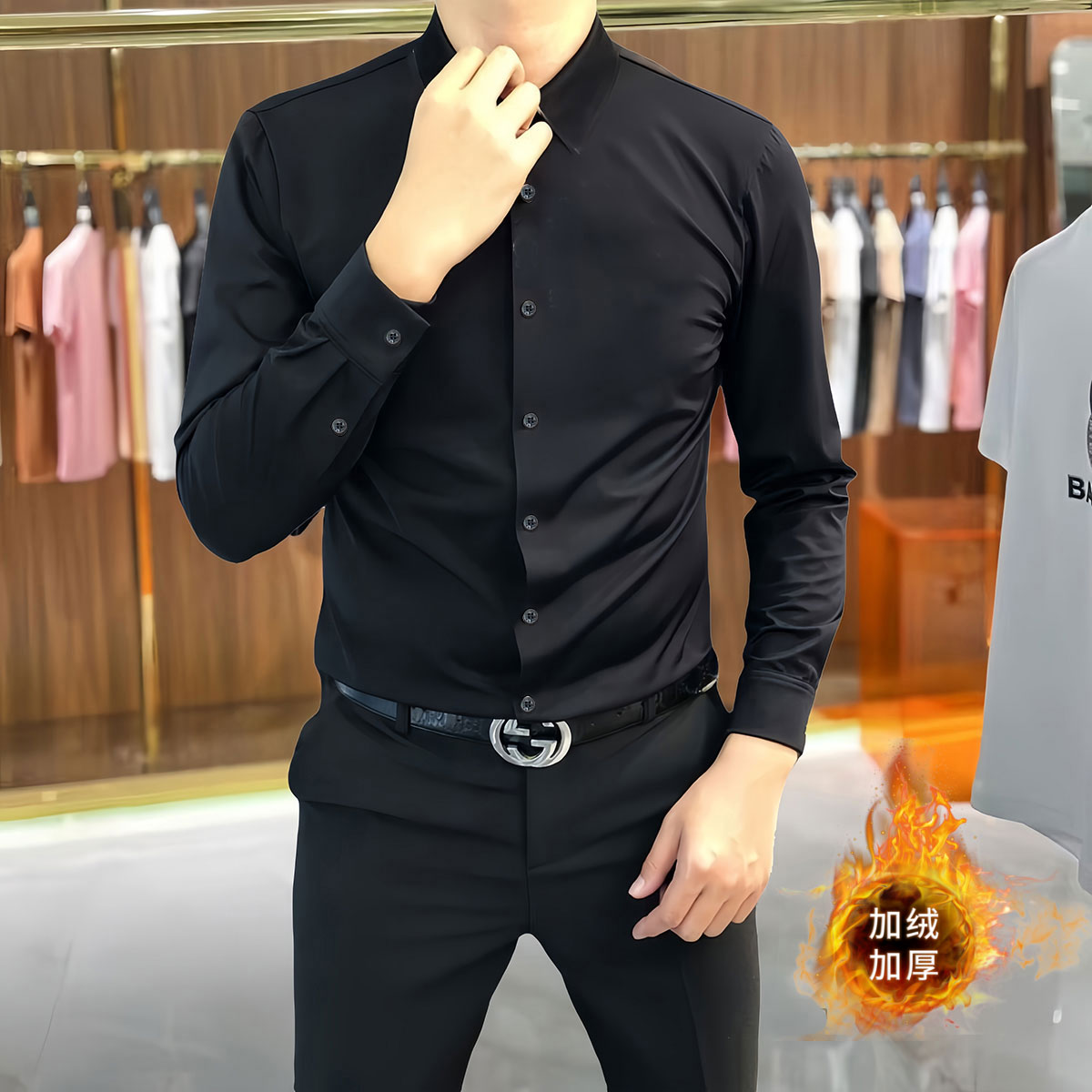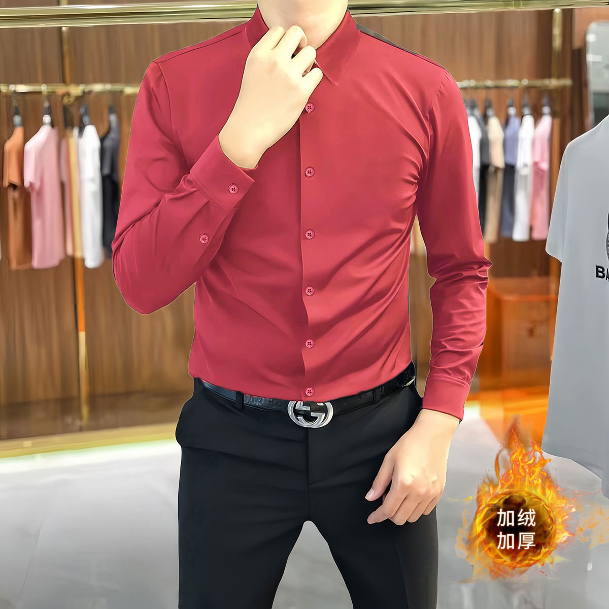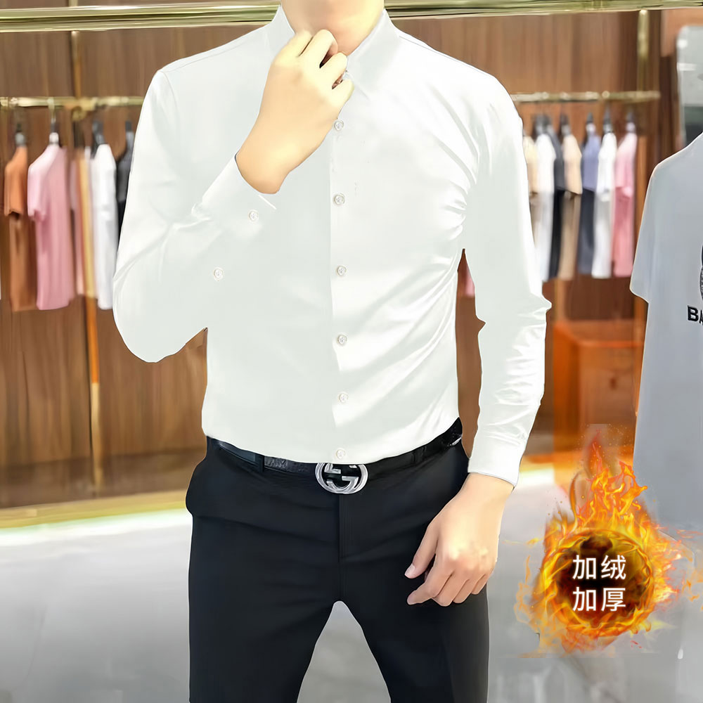 加绒衬衫男士长袖修身高弹秋冬磨毛免烫轻奢商务正装红色保暖衬衣