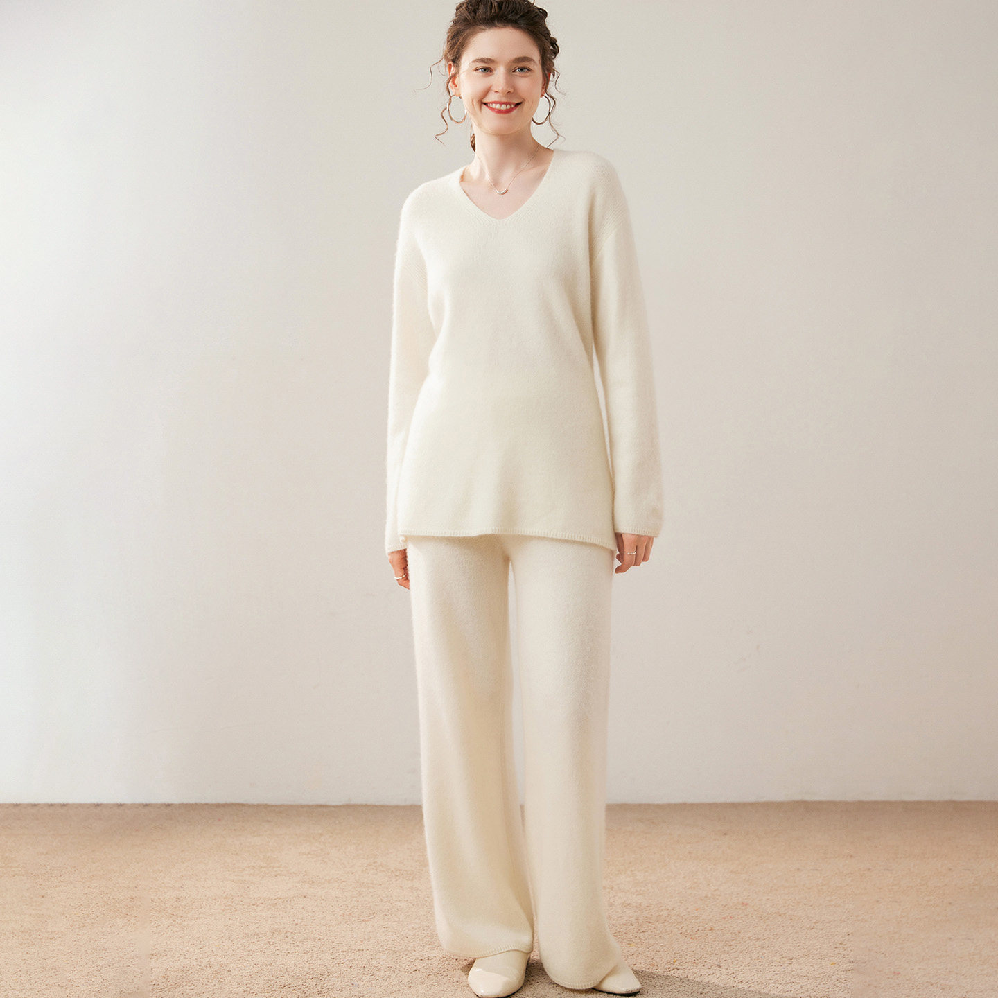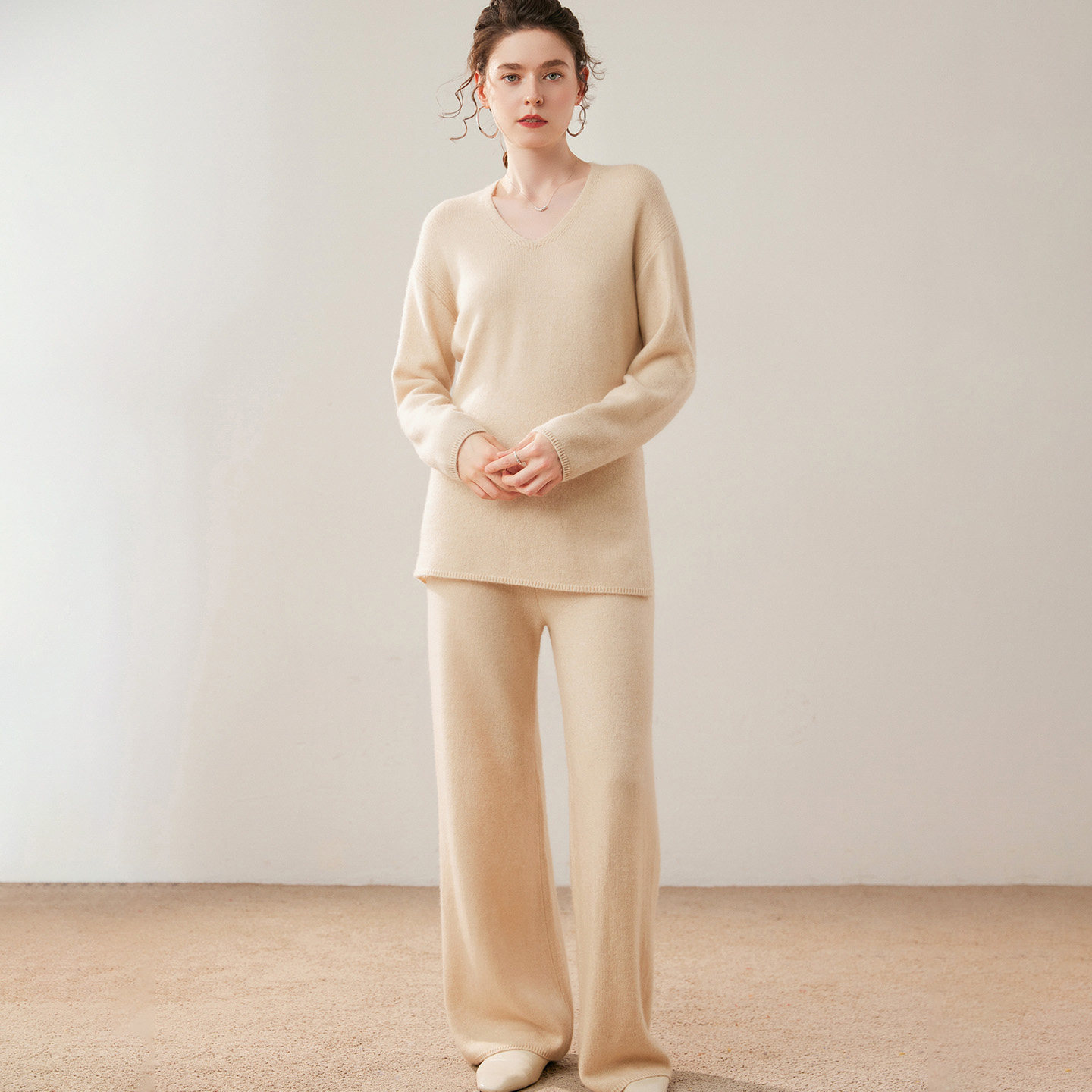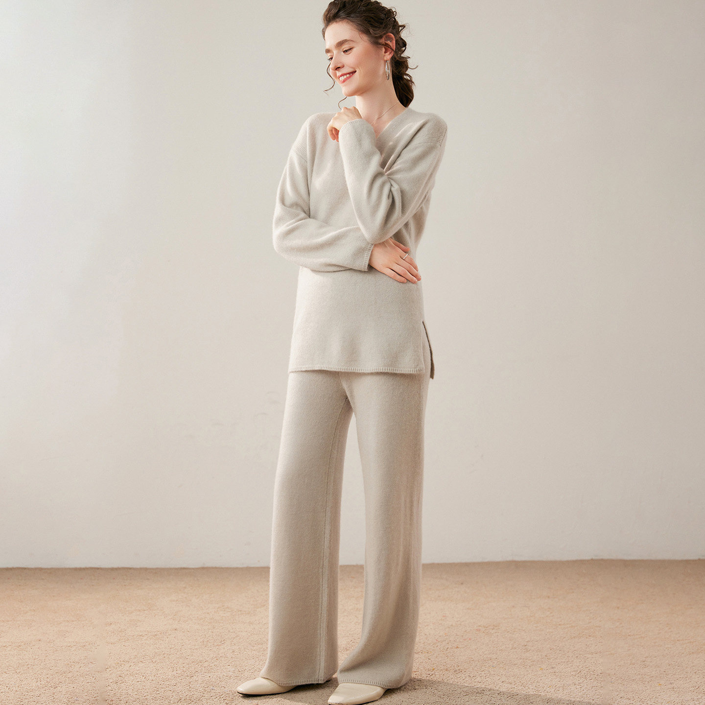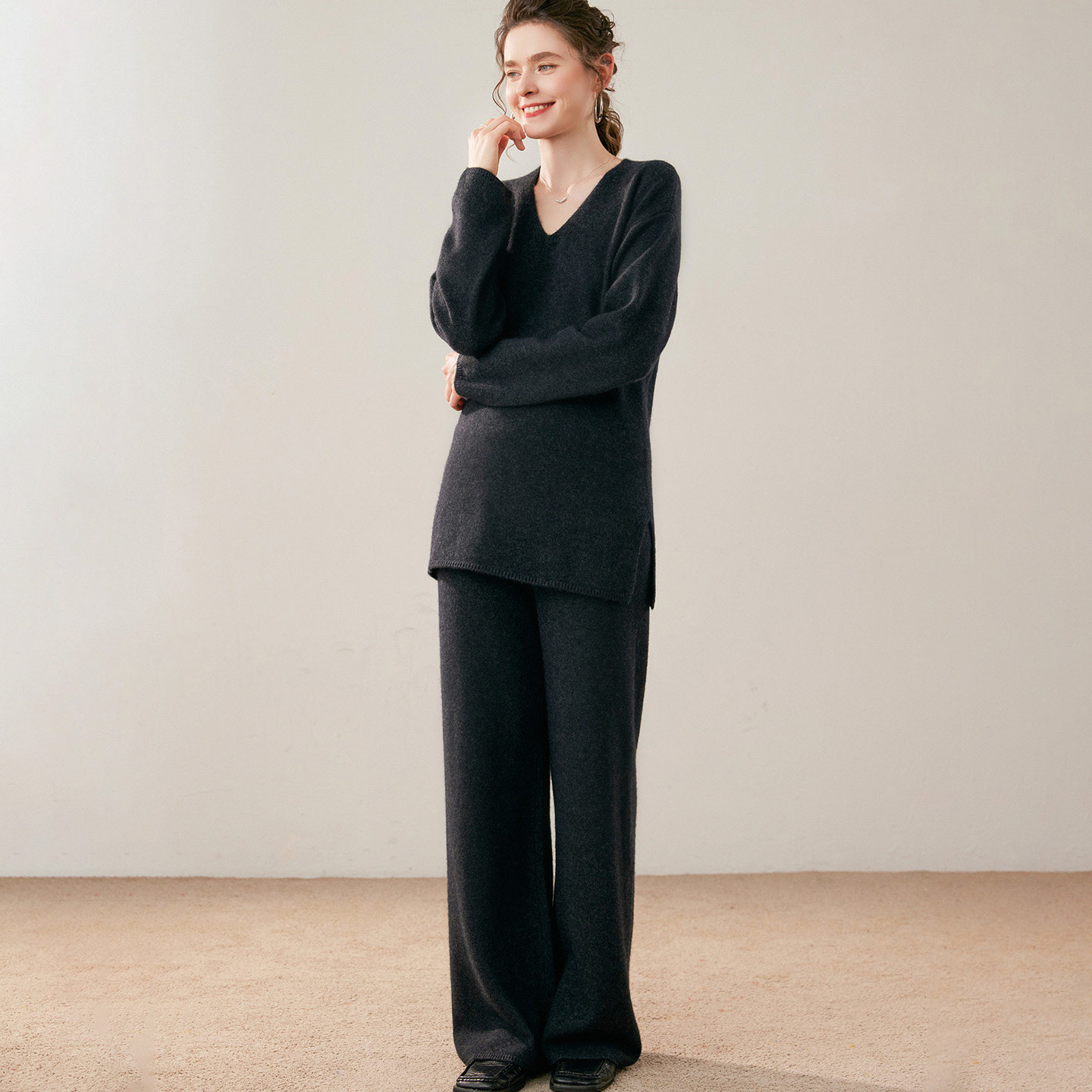 好养眼 同色系山羊绒套装V领宽松上衣加厚高腰直筒阔腿裤针织套装