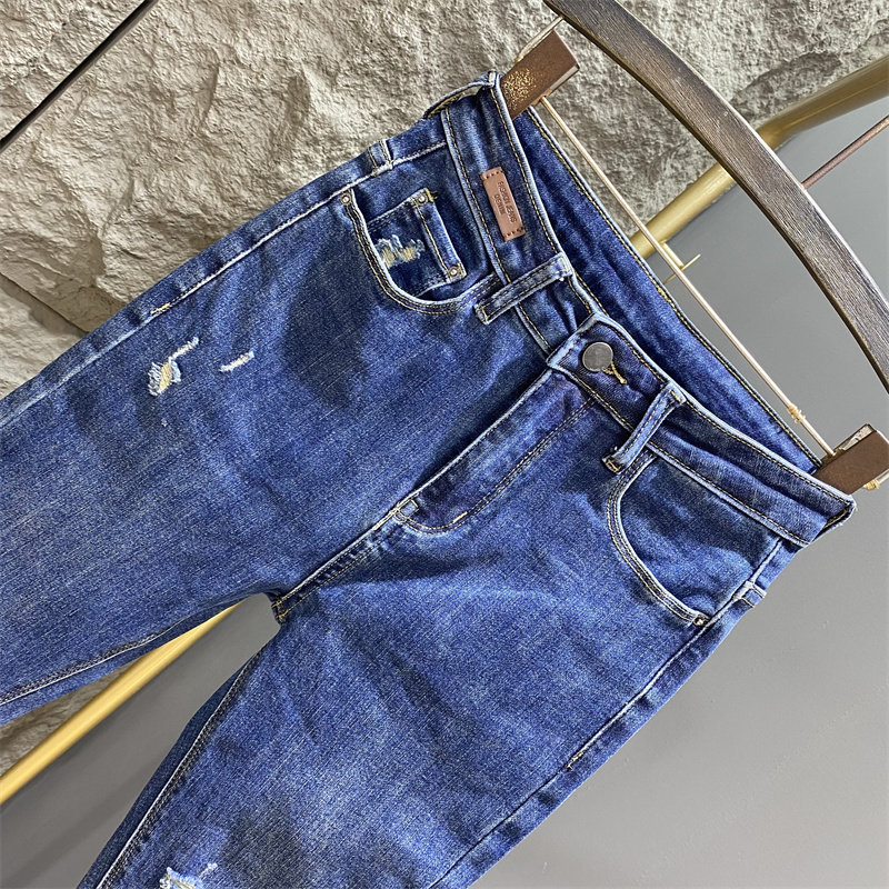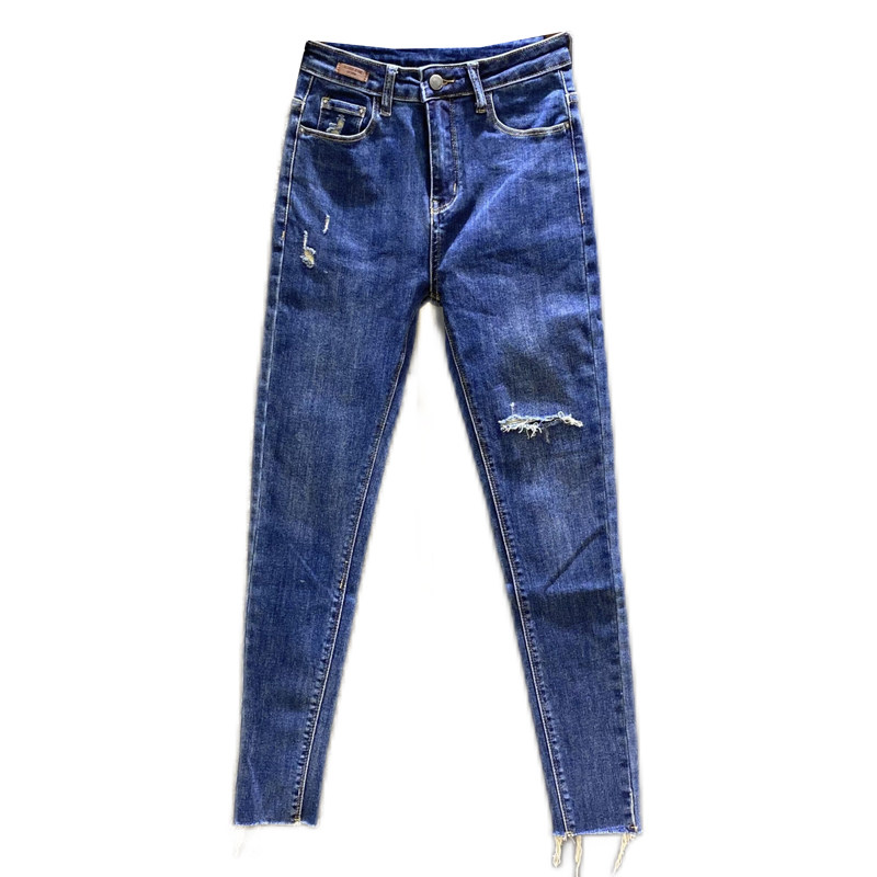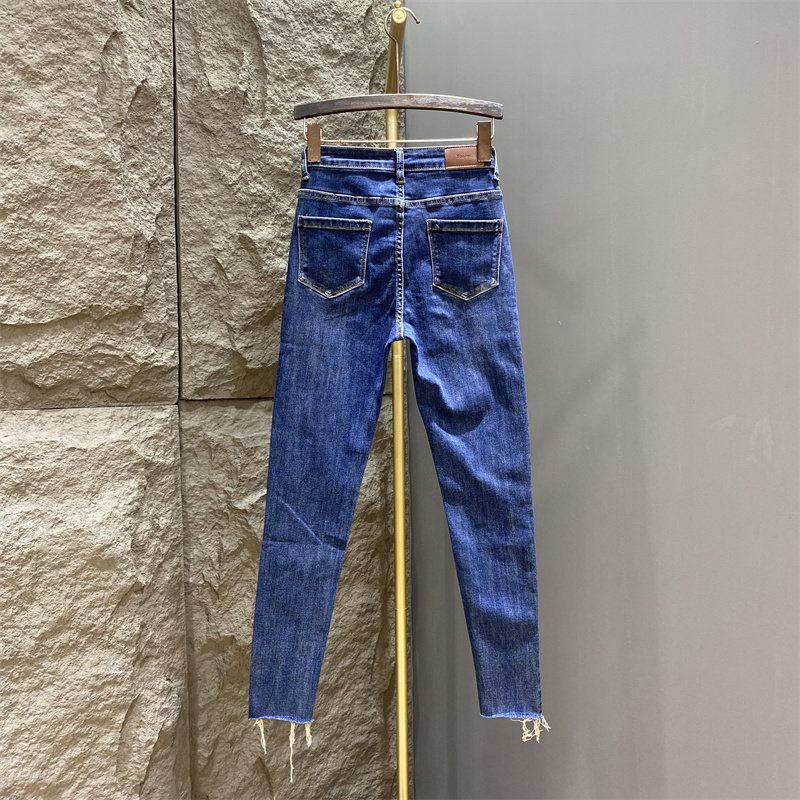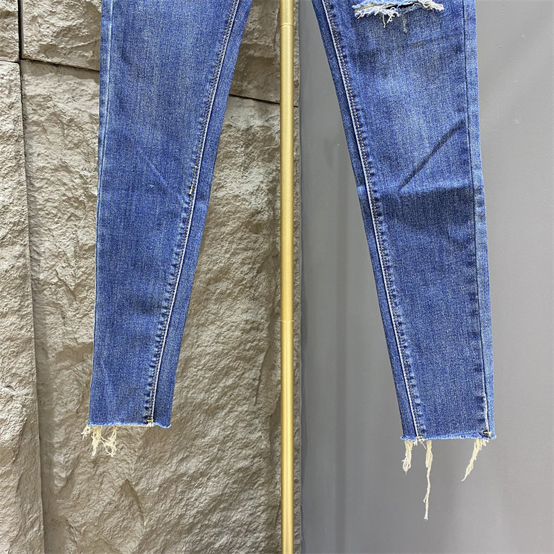 欧货2026春季新款抓纹破洞休闲小脚牛仔裤女蓝色高腰九分铅笔裤子