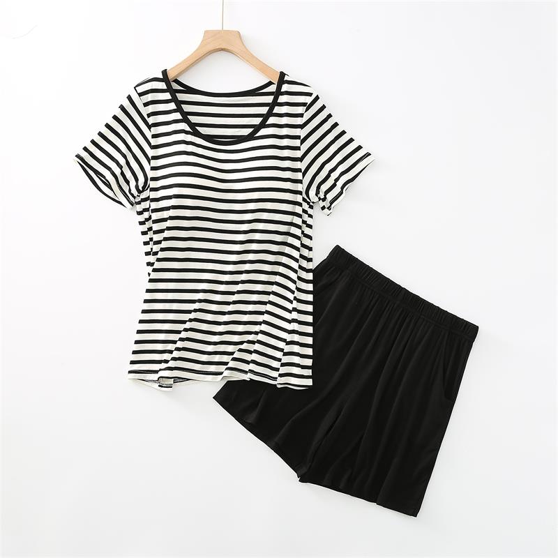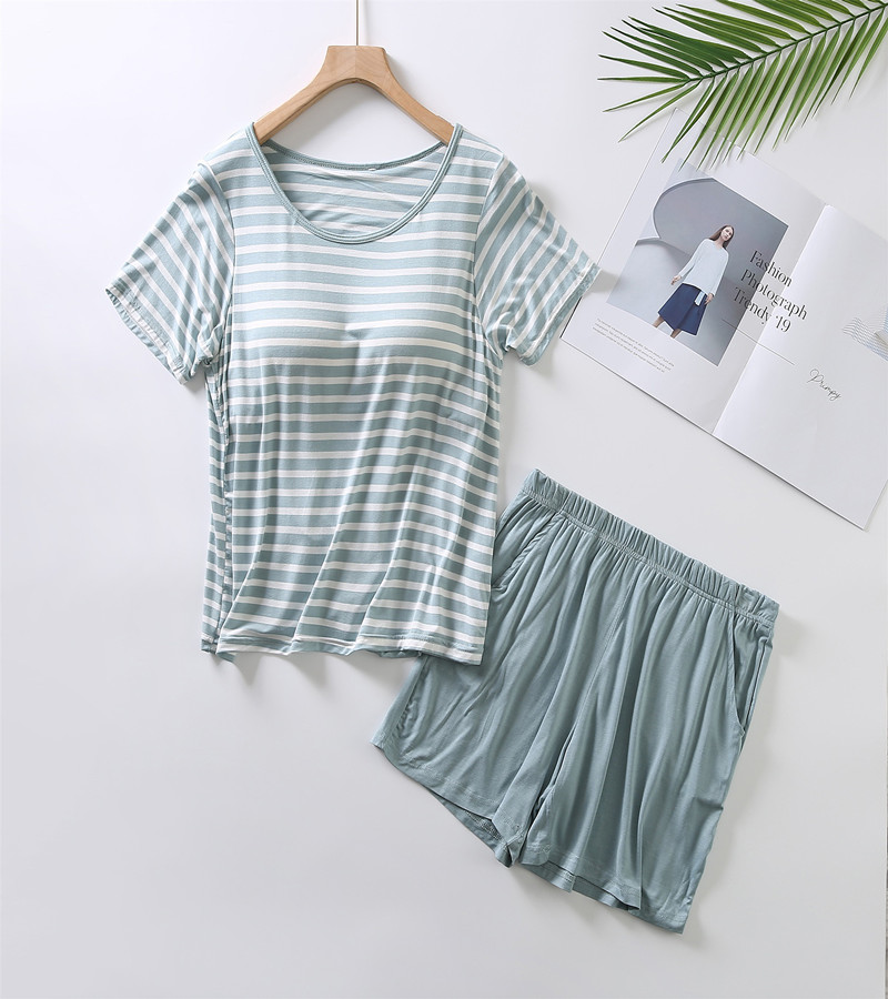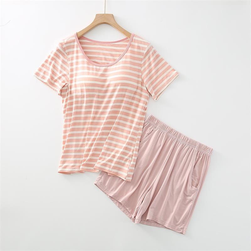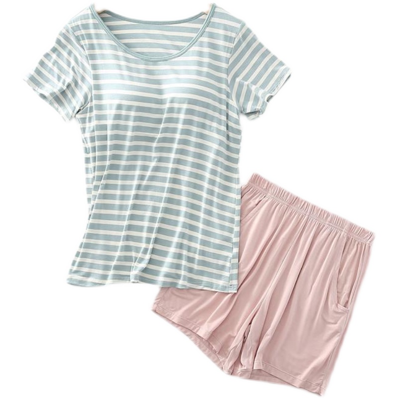 莫代尔女夏带胸垫半袖条纹运动套装宽松版大码短袖睡衣短裤家居服