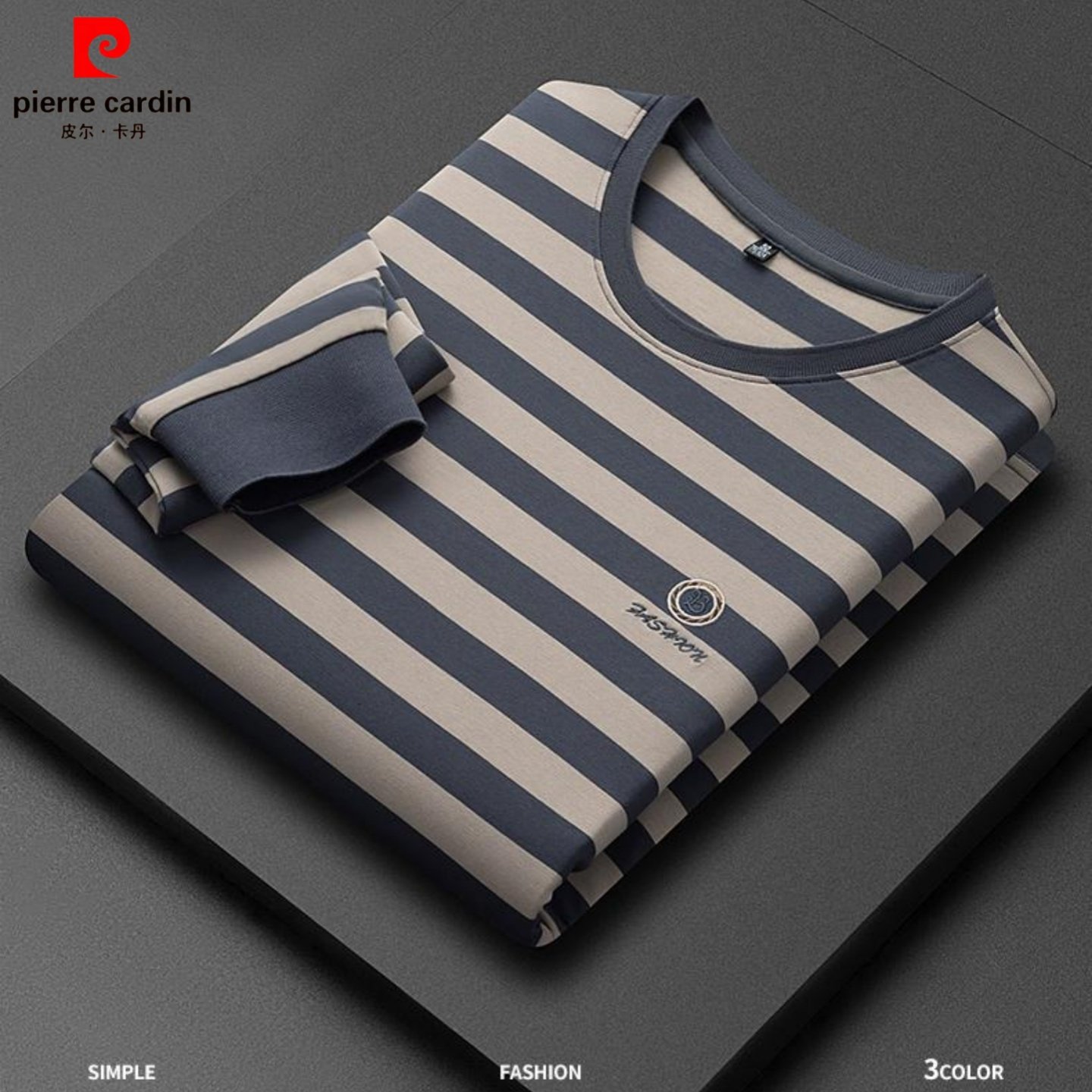 皮尔卡丹正品长绒棉春秋条纹圆领长袖T恤男士休闲时尚打底衫卫衣