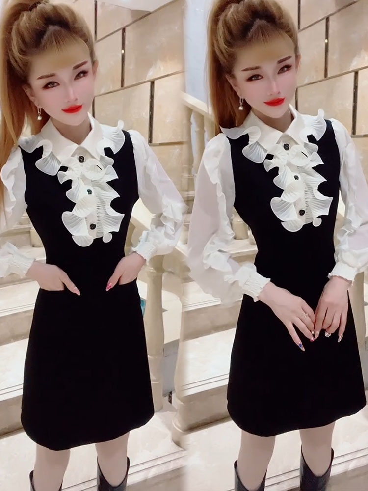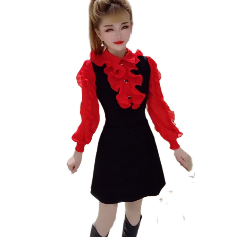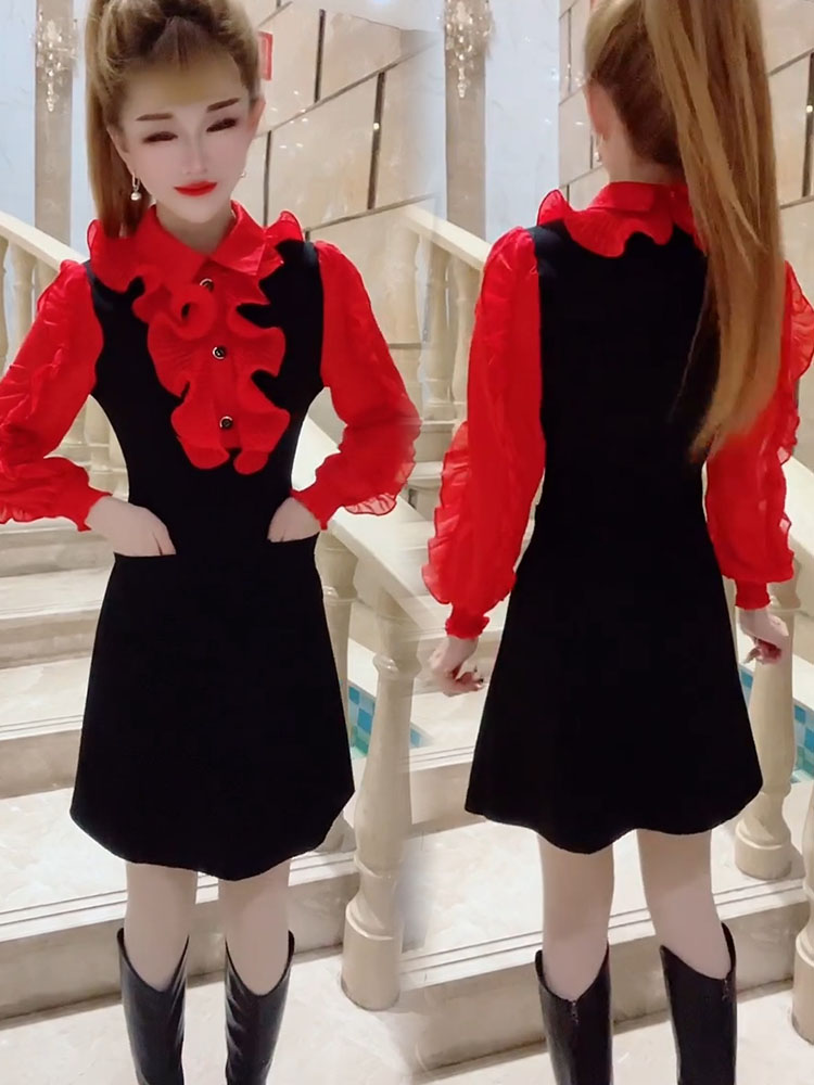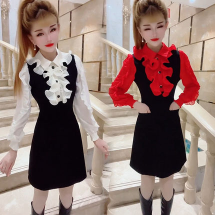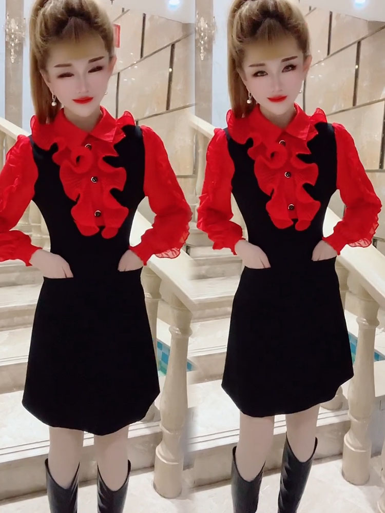 2024年秋冬新款连衣裙韩版甜美减龄遮肉中长款收腰A字裙飞边女裙