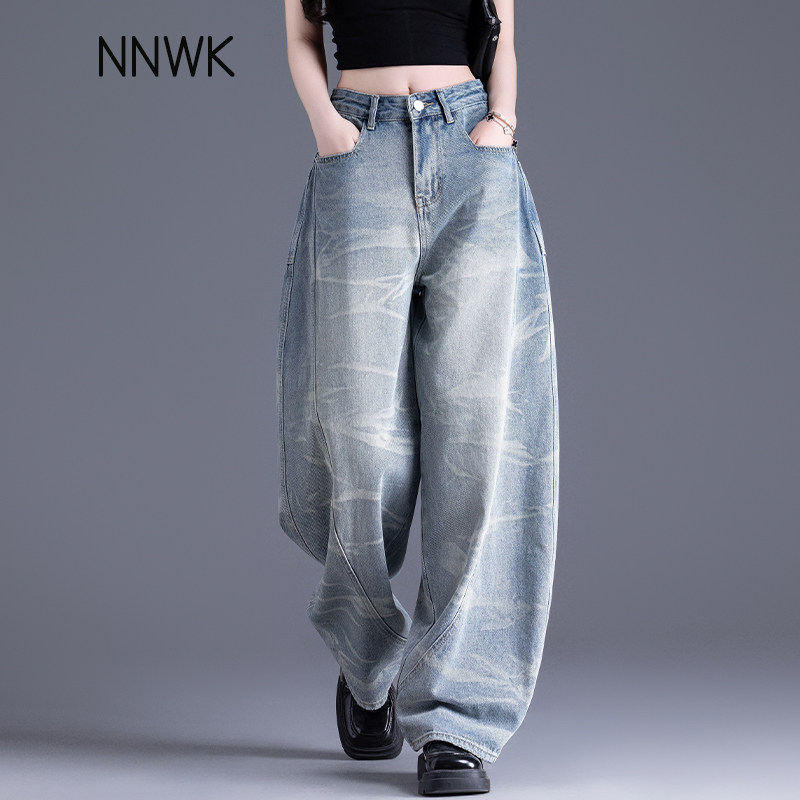 弯刀牛仔裤女复古扎染阔腿哈伦裤