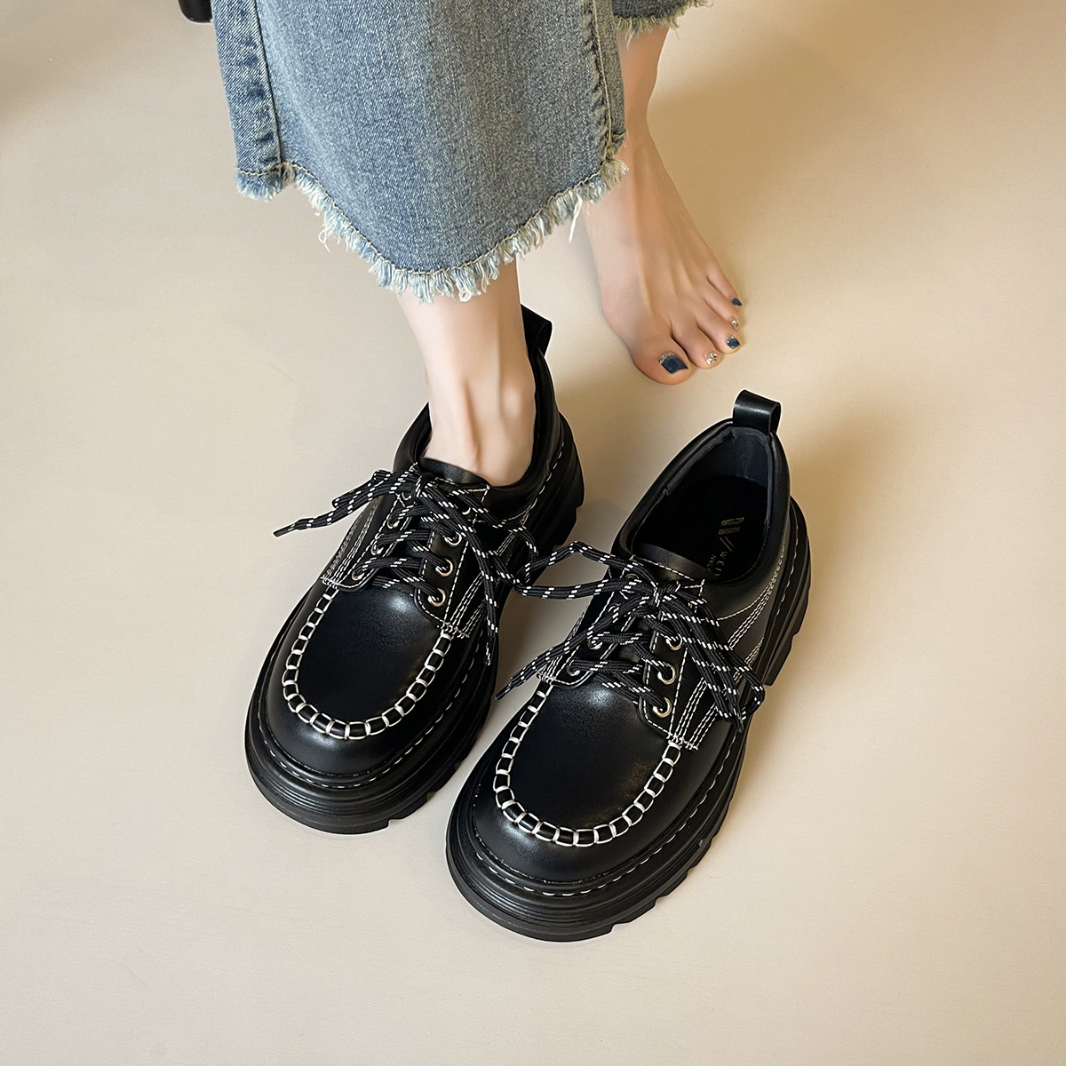 大码女鞋41到43厚底小皮鞋系带手工缝线乐福鞋英伦风增高配阔腿裤