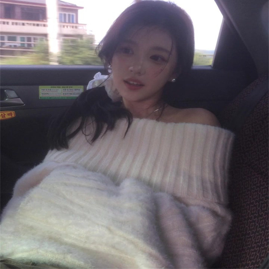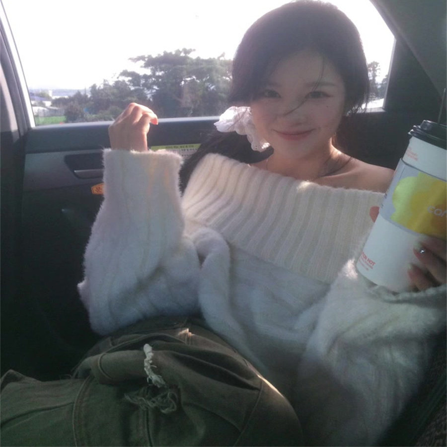 慵懒风一字肩纯欲白色软糯套头毛衣女秋冬季气质毛针织衫宽松上衣