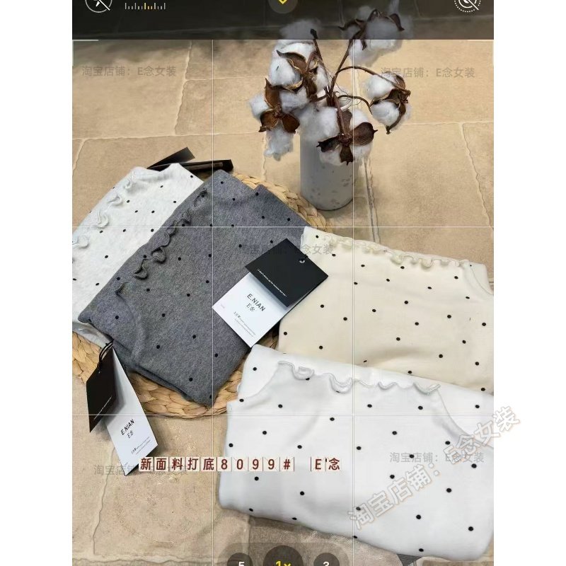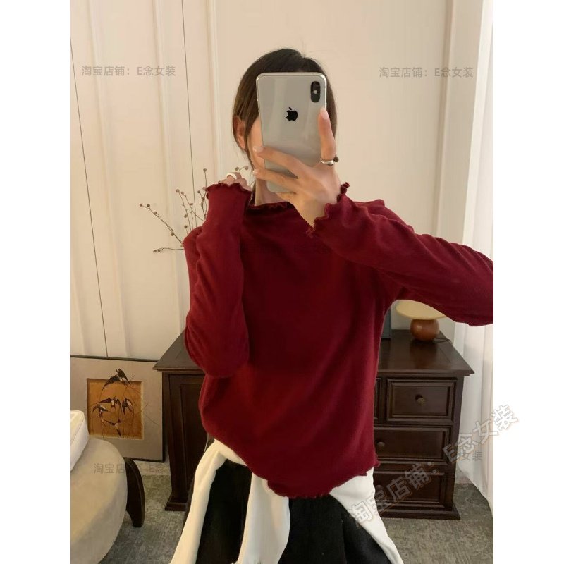 E念8099冬季新款半高领波点长袖打底衫女木耳边修身显瘦T恤上衣