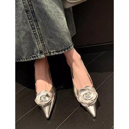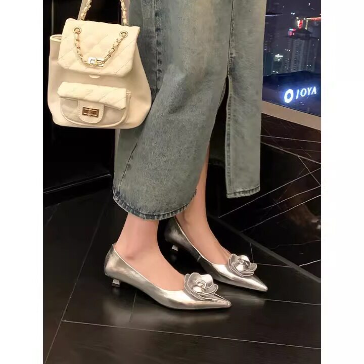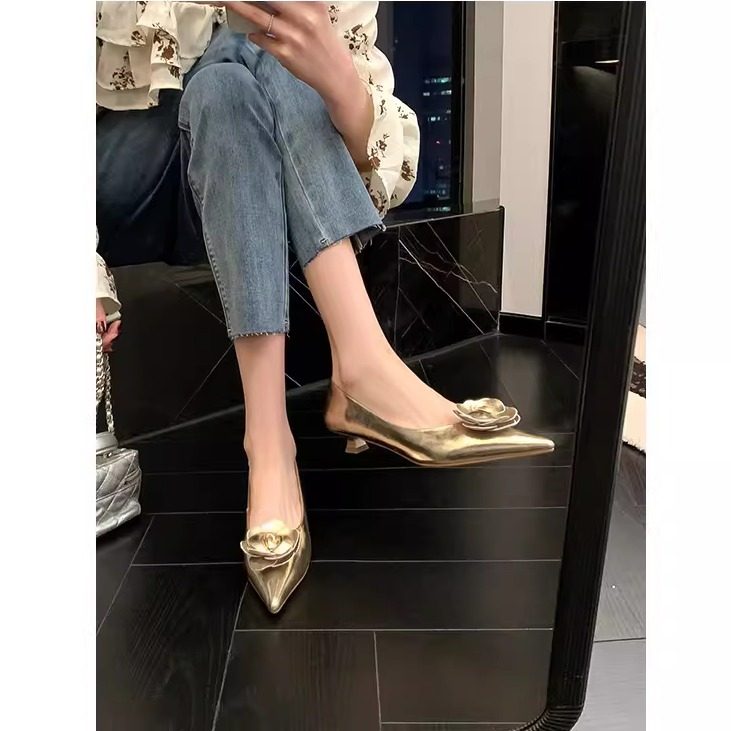 真皮法式复古山茶花气质百搭晚风温柔配裙子尖头小猫跟低跟单鞋女