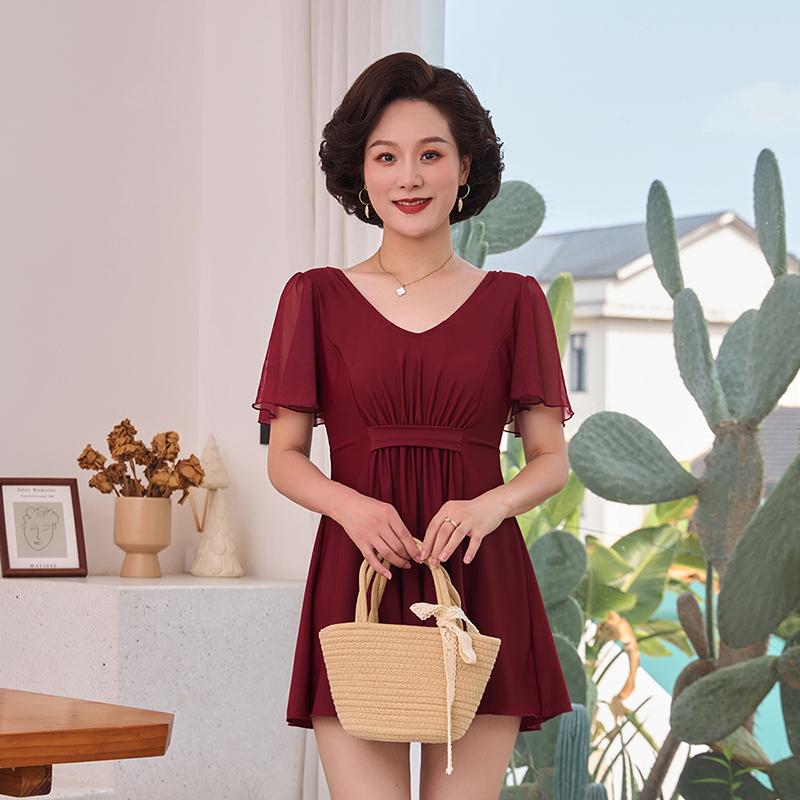 2025新款泡温泉大码连体裙式泳衣女妈妈宽松胖mm纯色时尚遮肚泳装