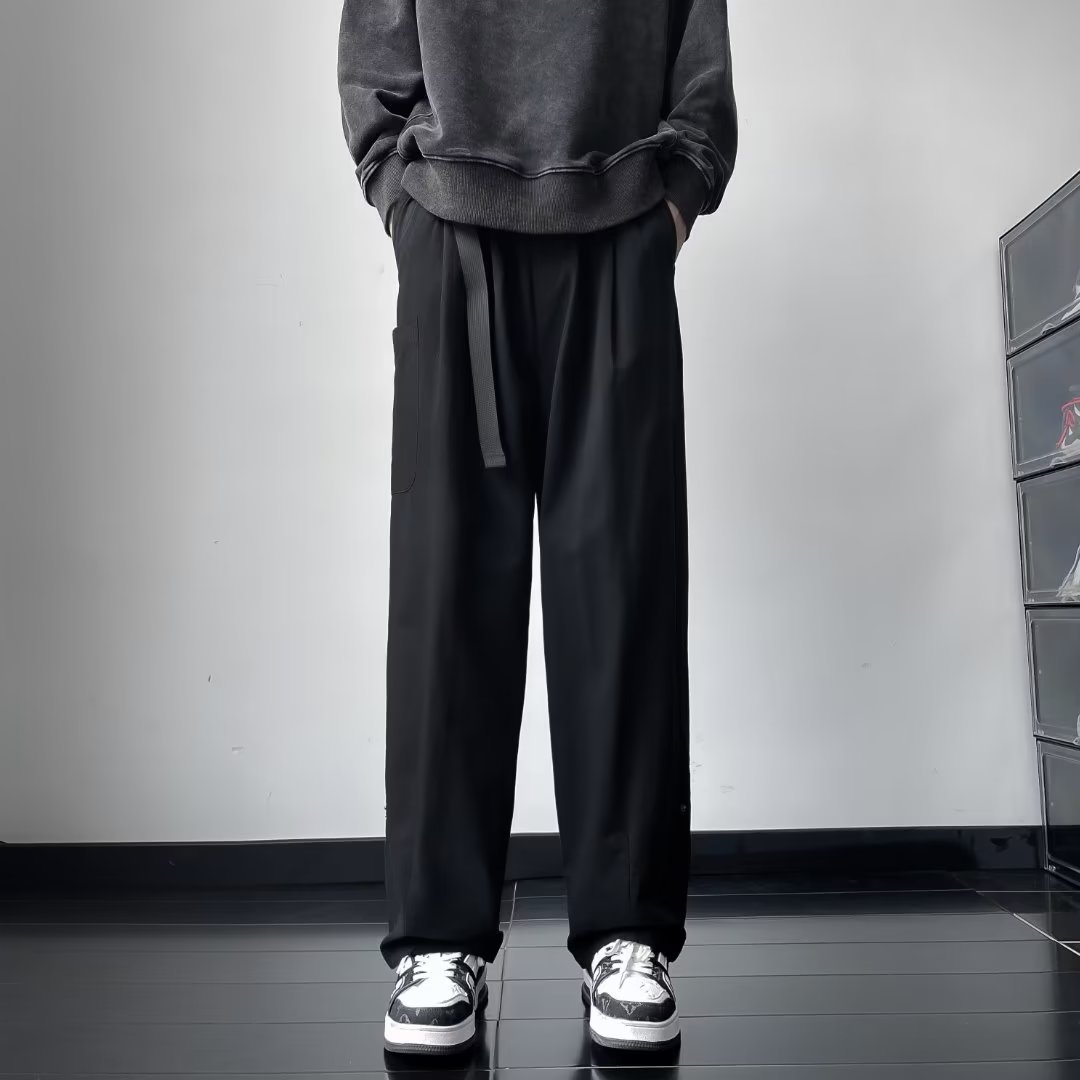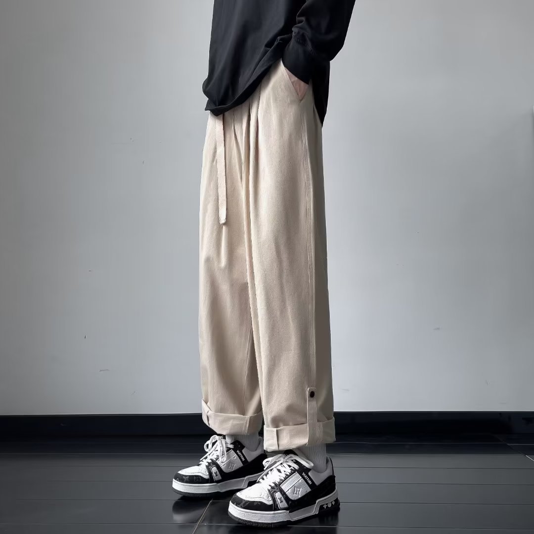 卷边搭扣裤子男宽松直筒秋款韩版潮流大码阔腿坠感九分休闲长裤