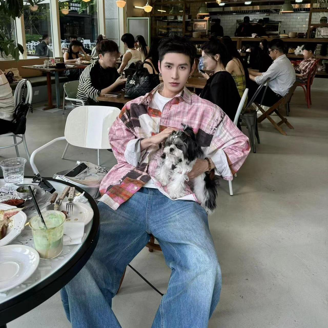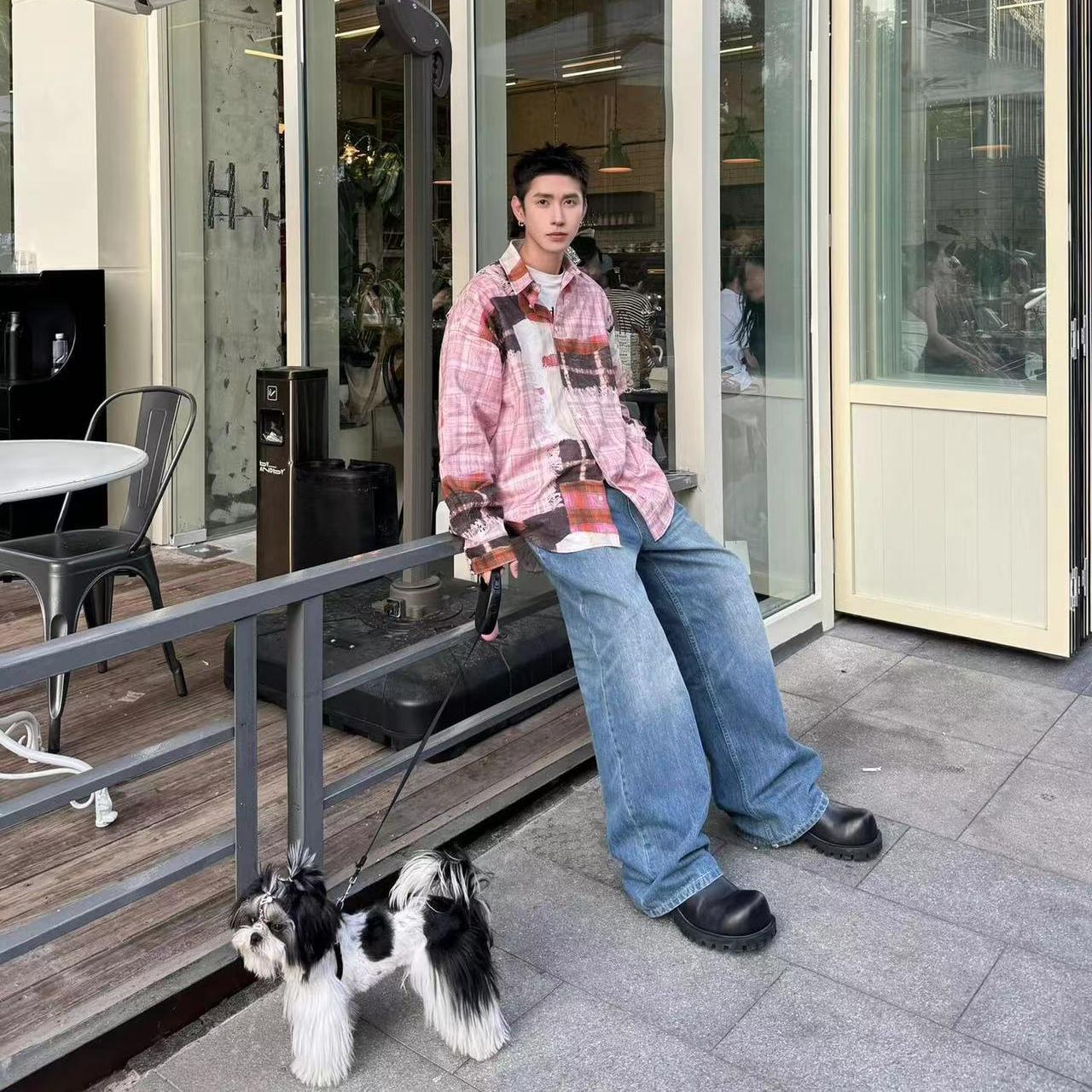 复古休闲拼接解构设计做旧宽松油画格子衬衫男女美式高级感外套男