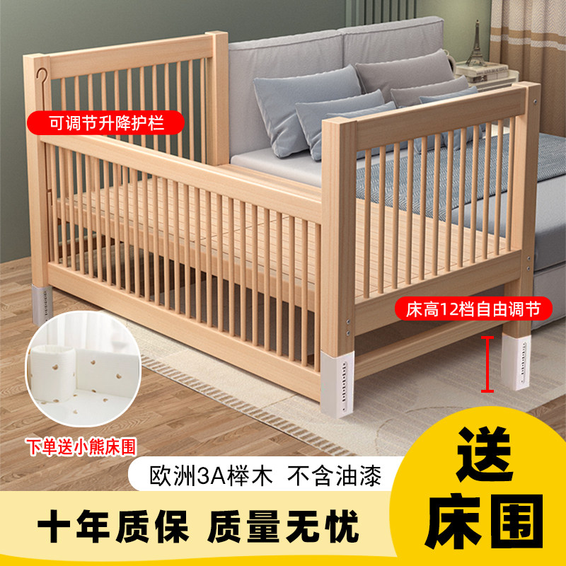 圣美岛榉木儿童床拼接床带护栏可升降床边婴儿宝宝床实木加宽小床