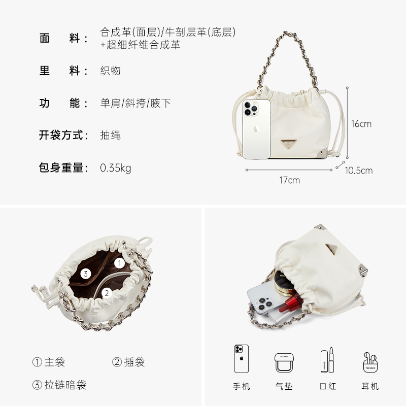 天美意真皮链条水桶包女2025新款包大容量斜挎包百搭手提通勤包女