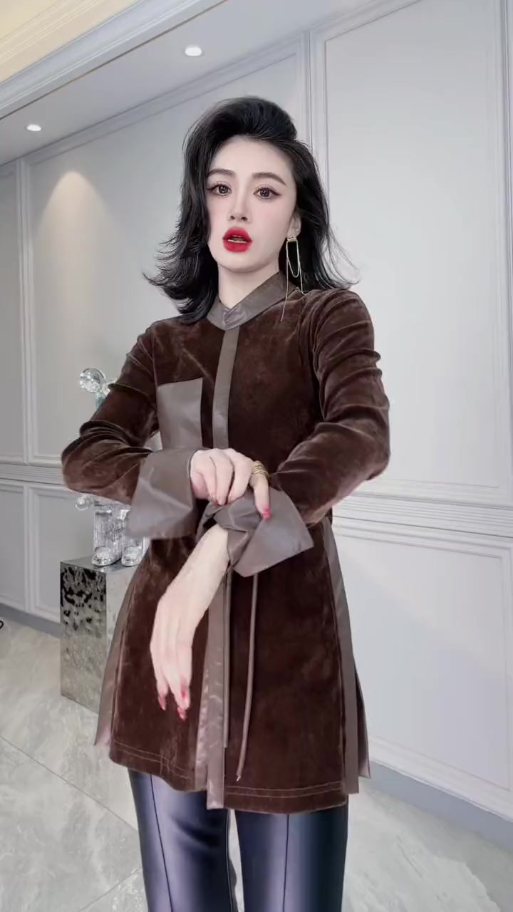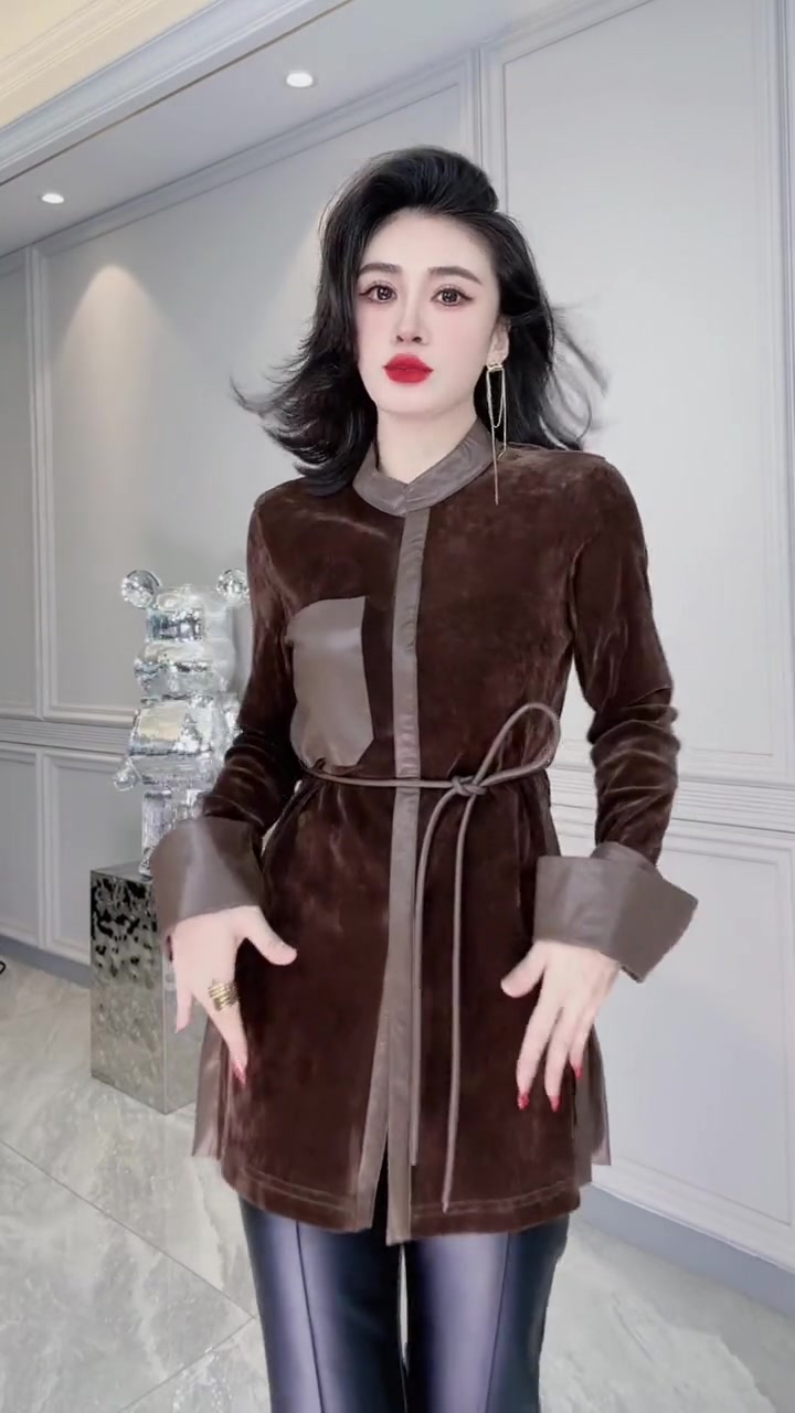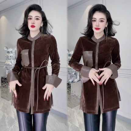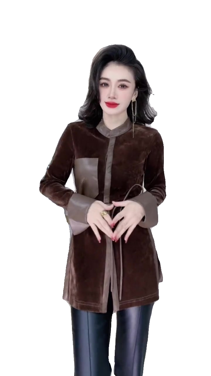 时尚洋气丝绒拼皮设计感衬衫女2023秋季新款收腰显瘦中长款衬衣潮