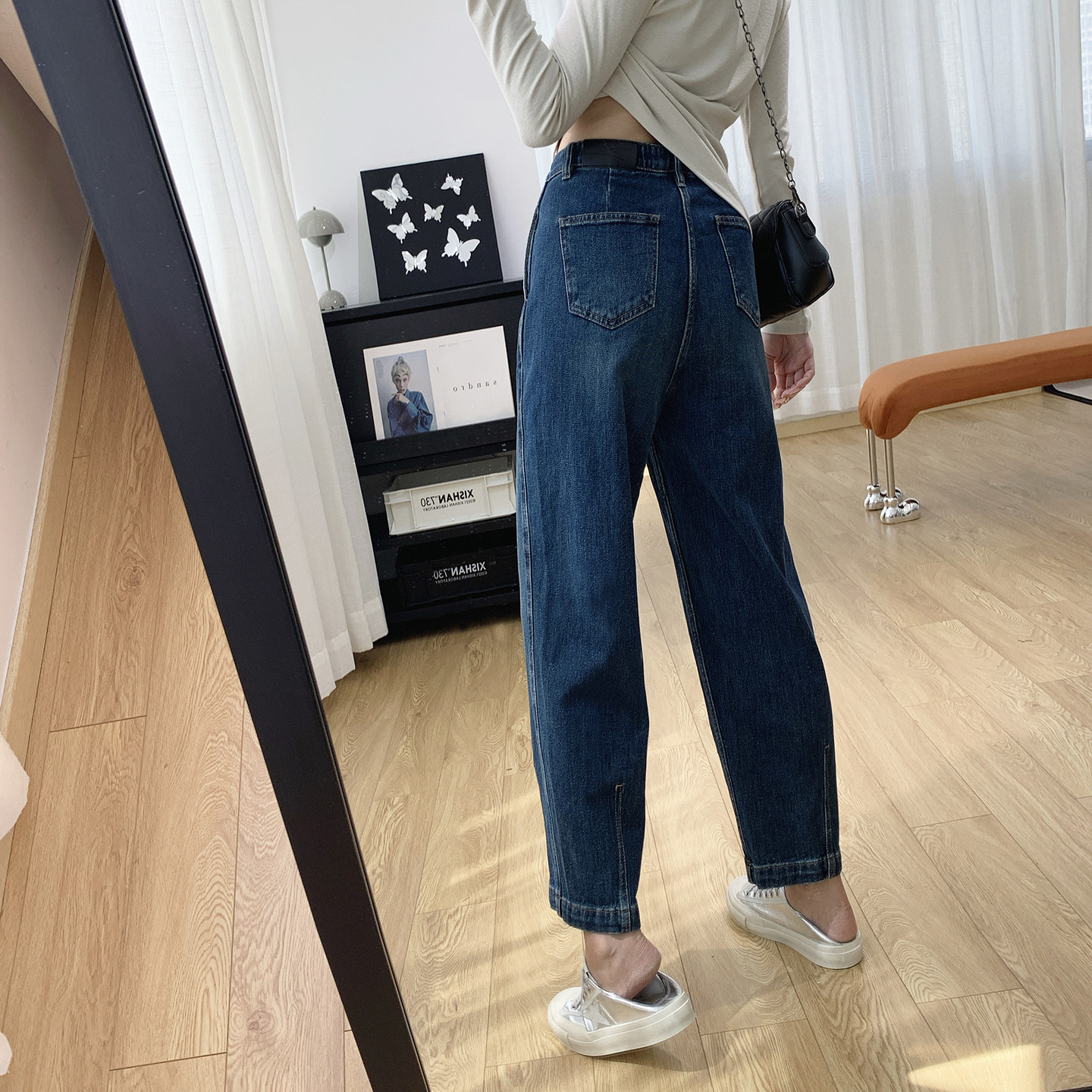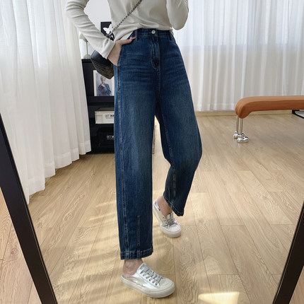 内置松紧腰显瘦锥形裤高腰牛仔裤女秋季萝卜哈伦裤梨型身材裤子秋