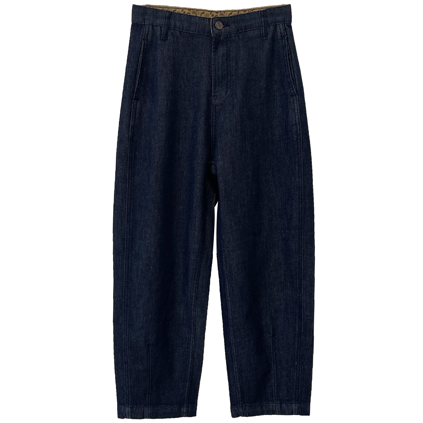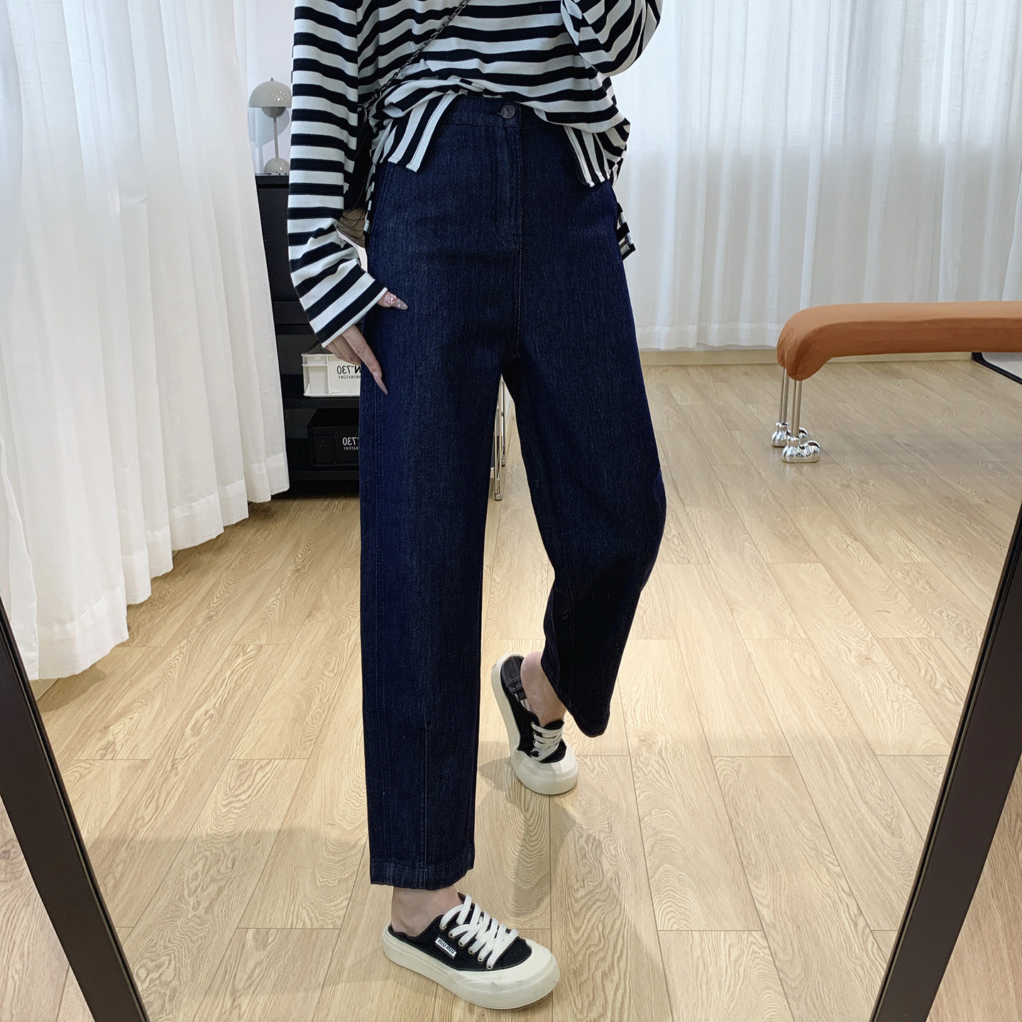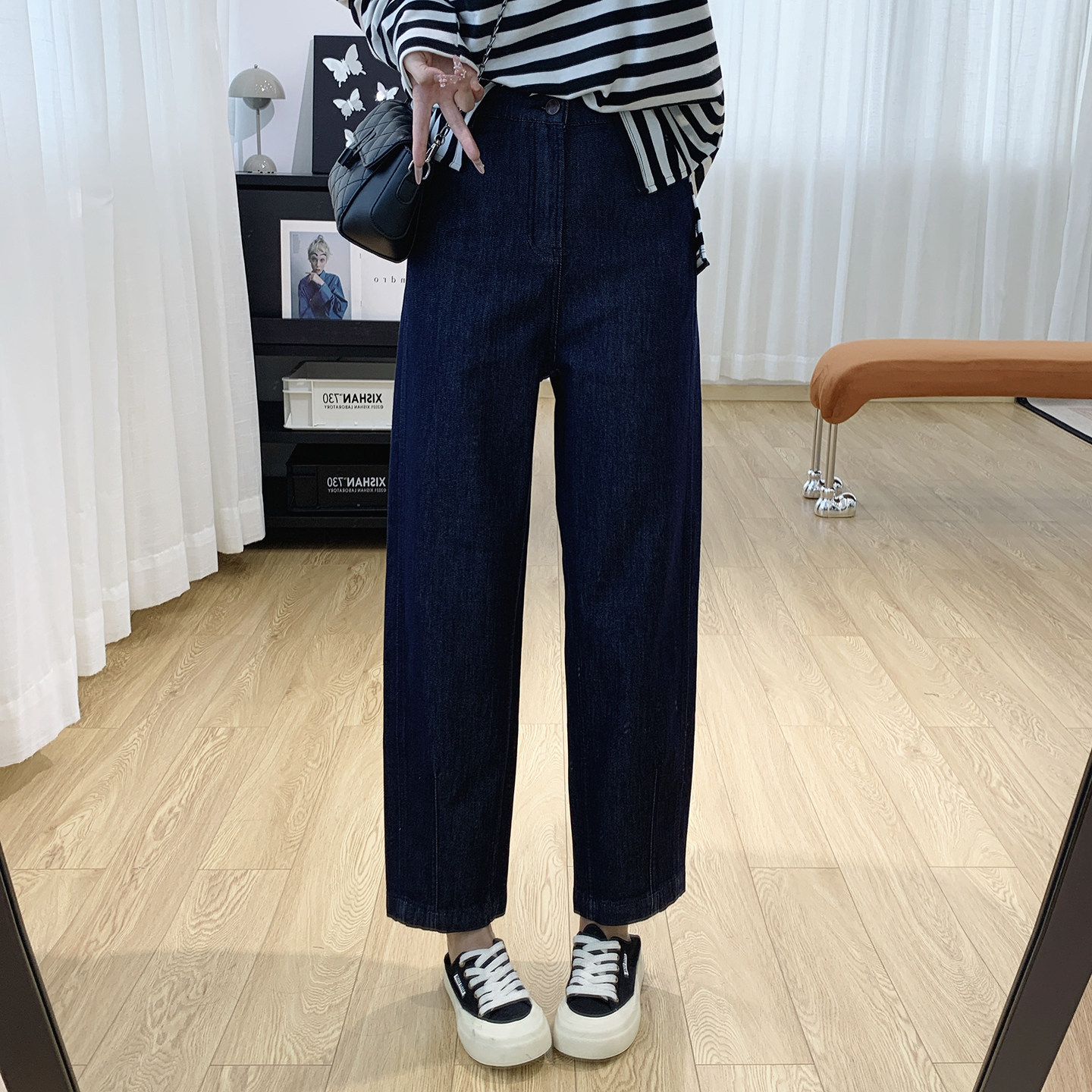 内置松紧腰显瘦锥形裤高腰牛仔裤
