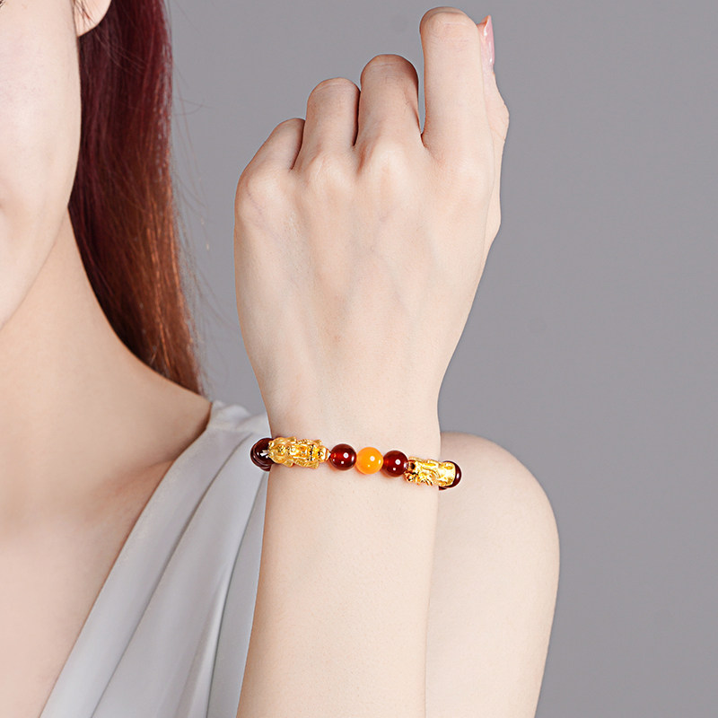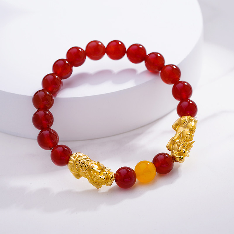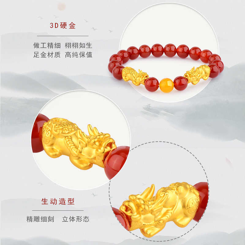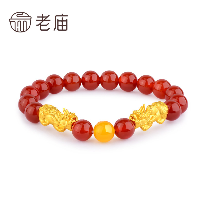 老庙黄金足金招财双貔貅玛瑙手串3D硬金手链转运串珠情侣官方正品