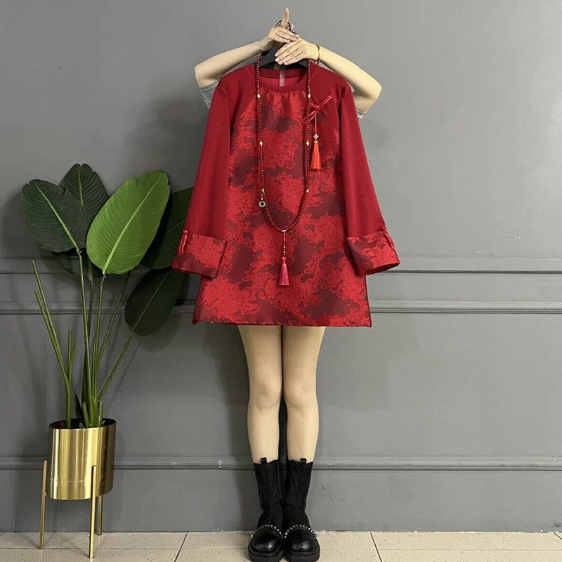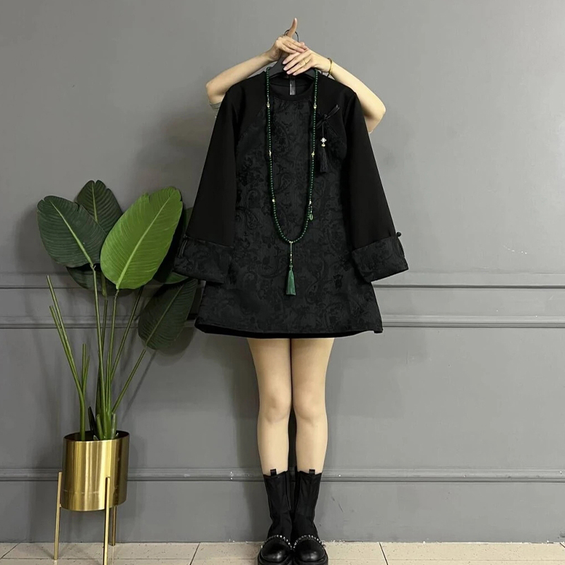 胖妹妹圆领盘扣复古风长袖上衣大码女装秋冬款休闲百搭宽松打底衫