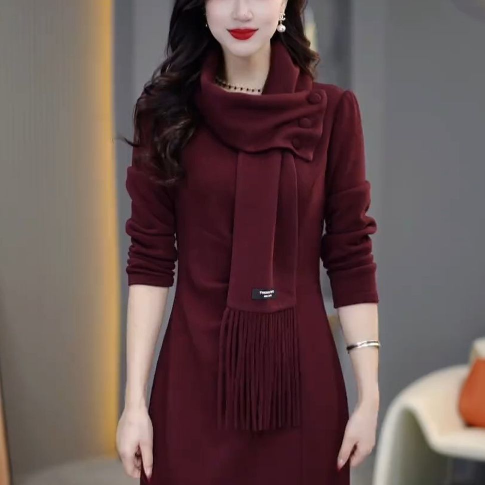 2025秋冬新款气质显瘦套装女设计感围巾打底连衣裙加绒保暖两件套
