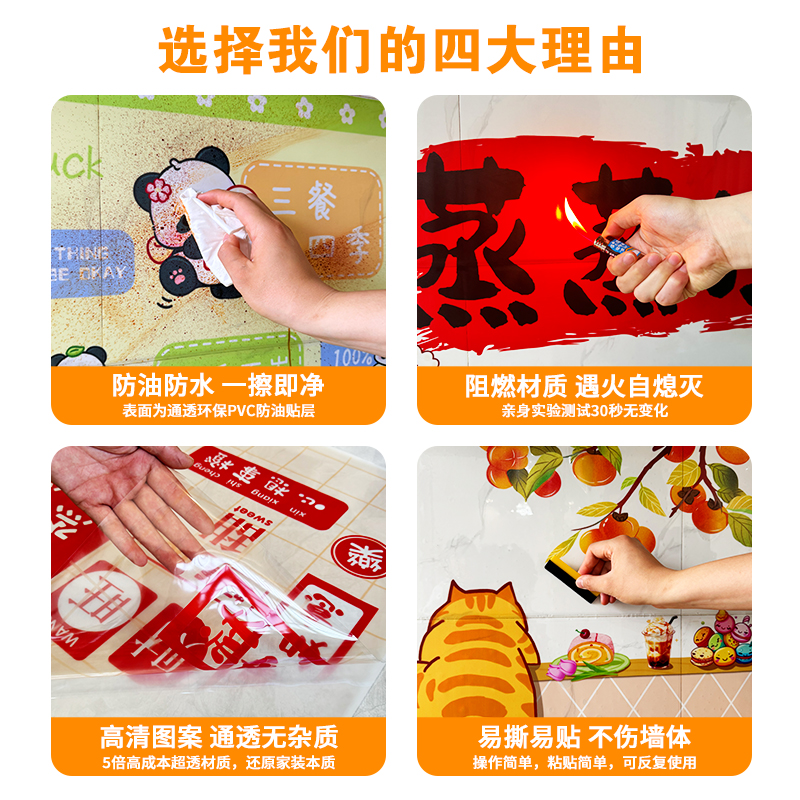 卡通厨房防油污静电无胶贴纸耐高温装饰灶台瓷砖防火静电无胶墙贴