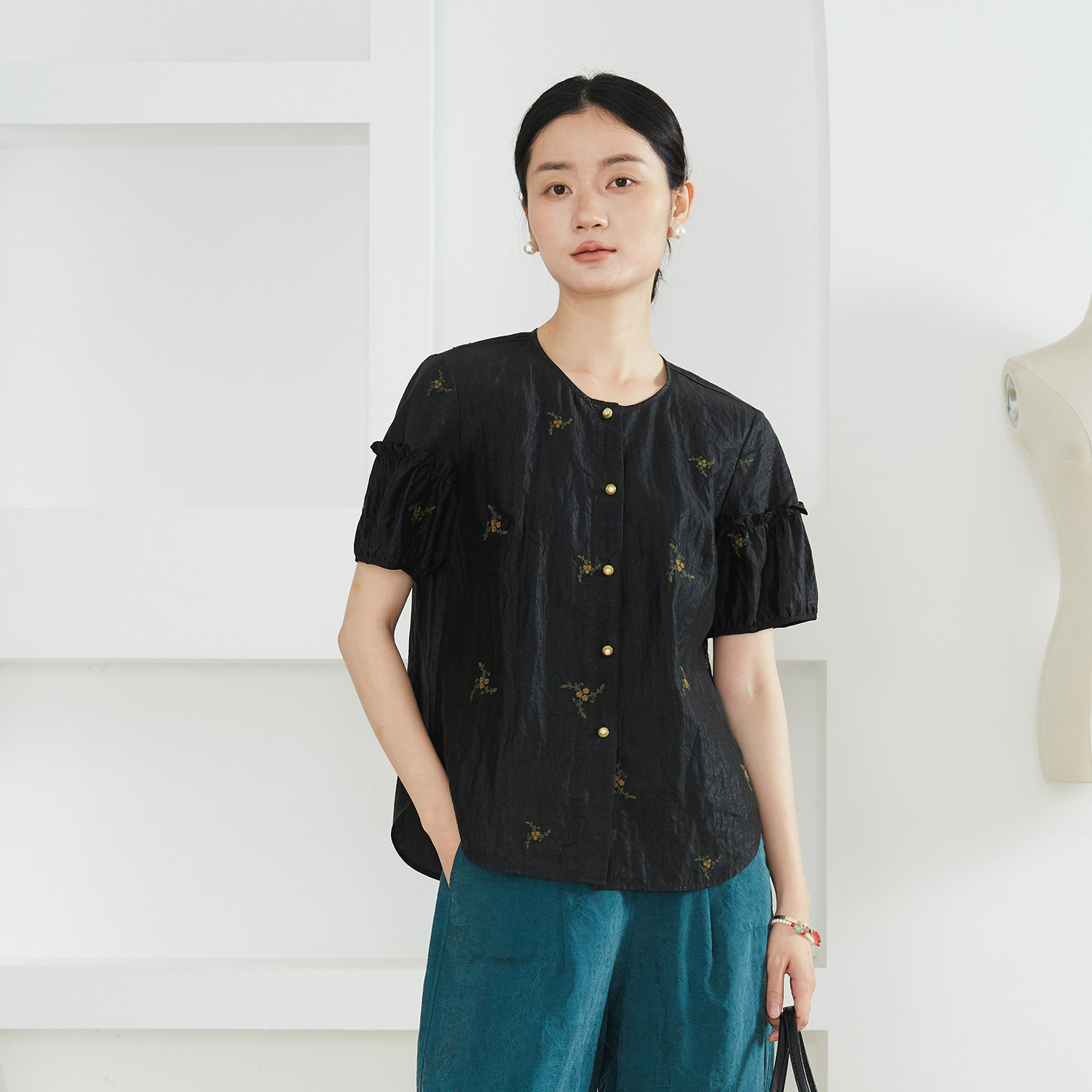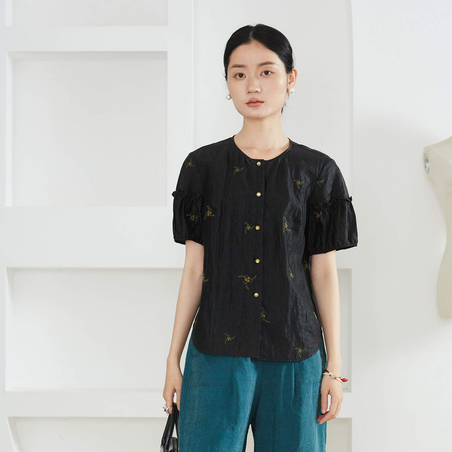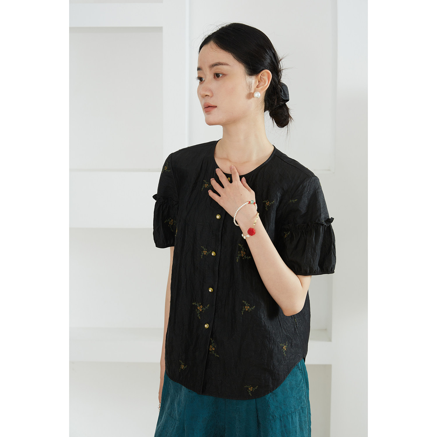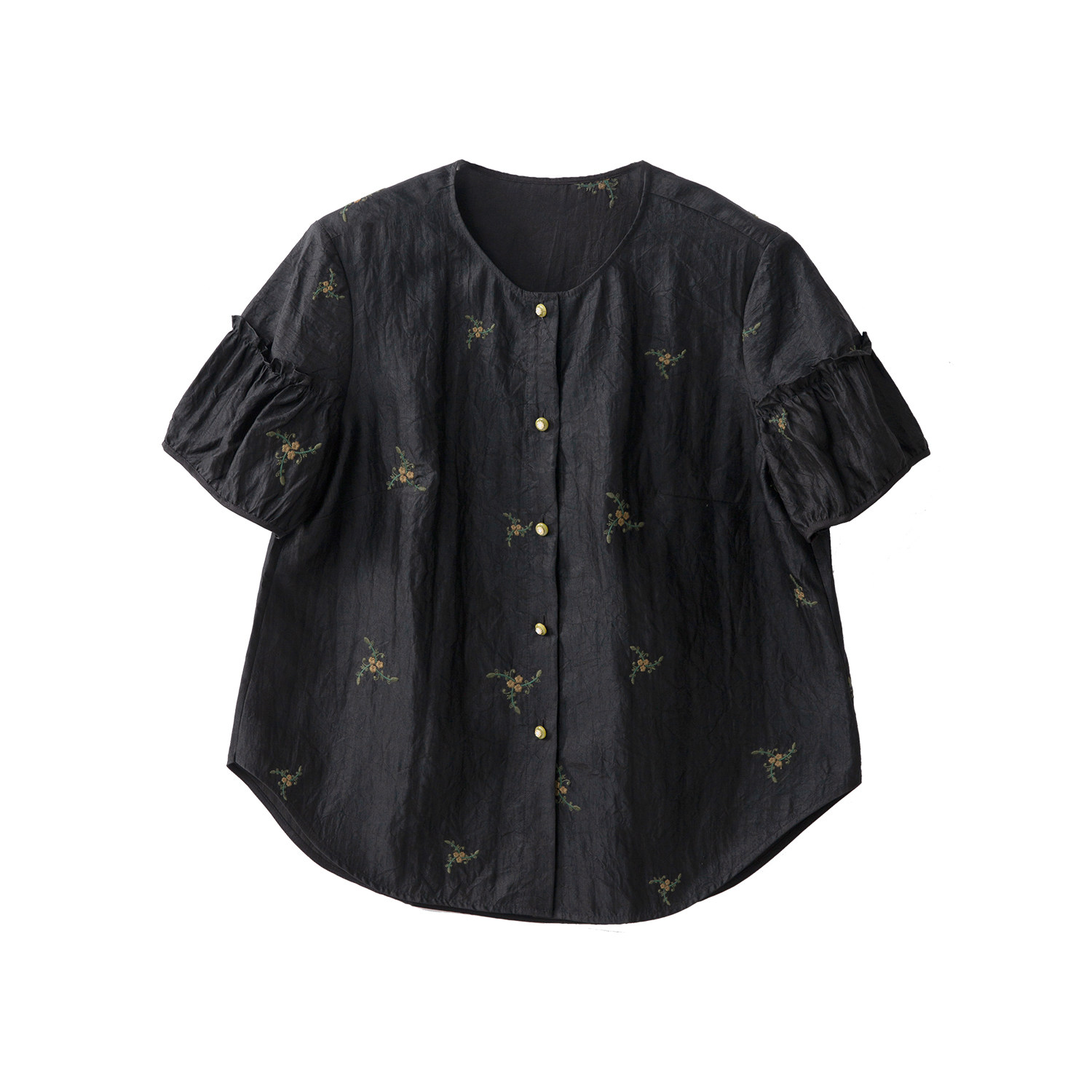 一丝牵 刺绣小花真丝香云纱短袖衬衫女100%桑蚕丝木耳袖圆领上衣