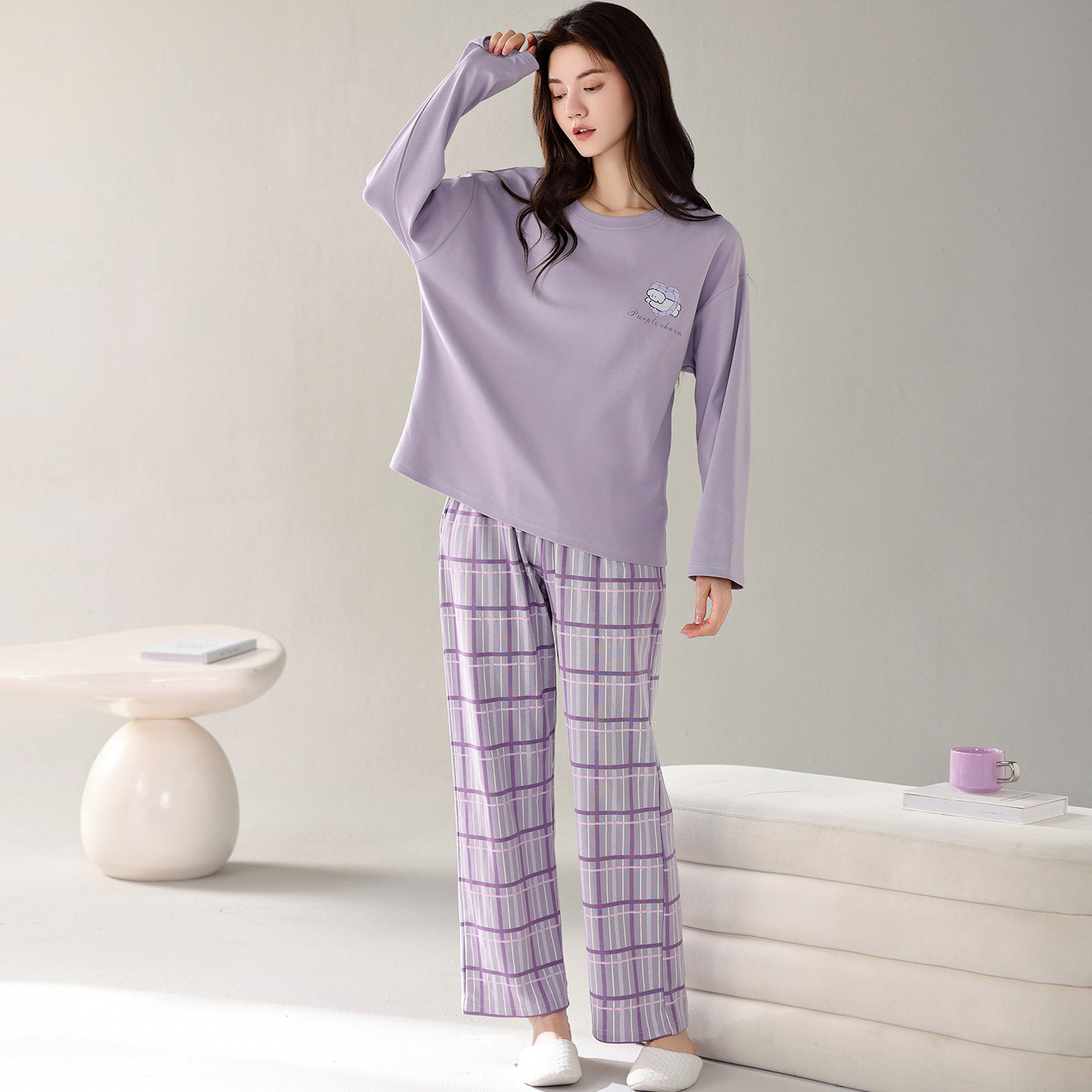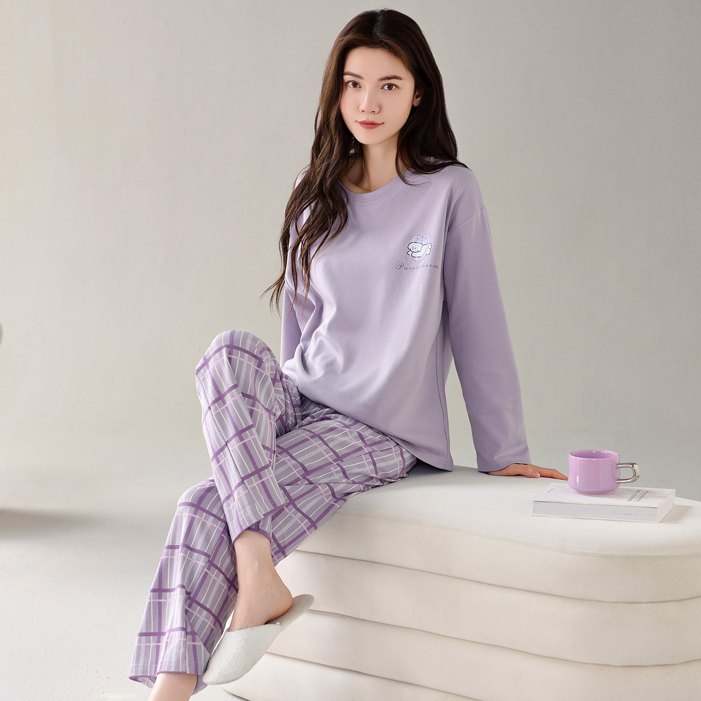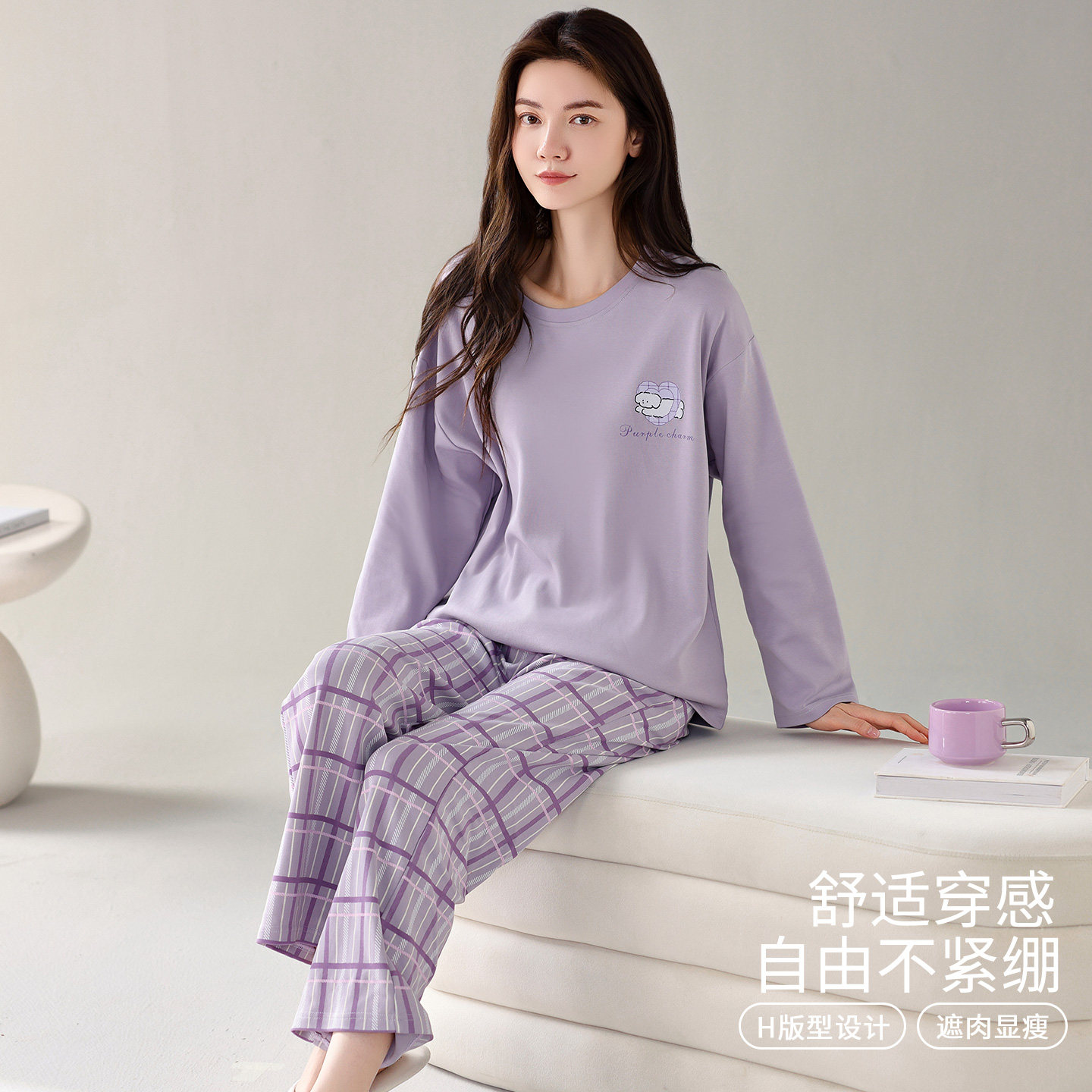 芬腾可安长袖睡衣女款2026新款春秋款紫色家居服纯棉布料100全棉