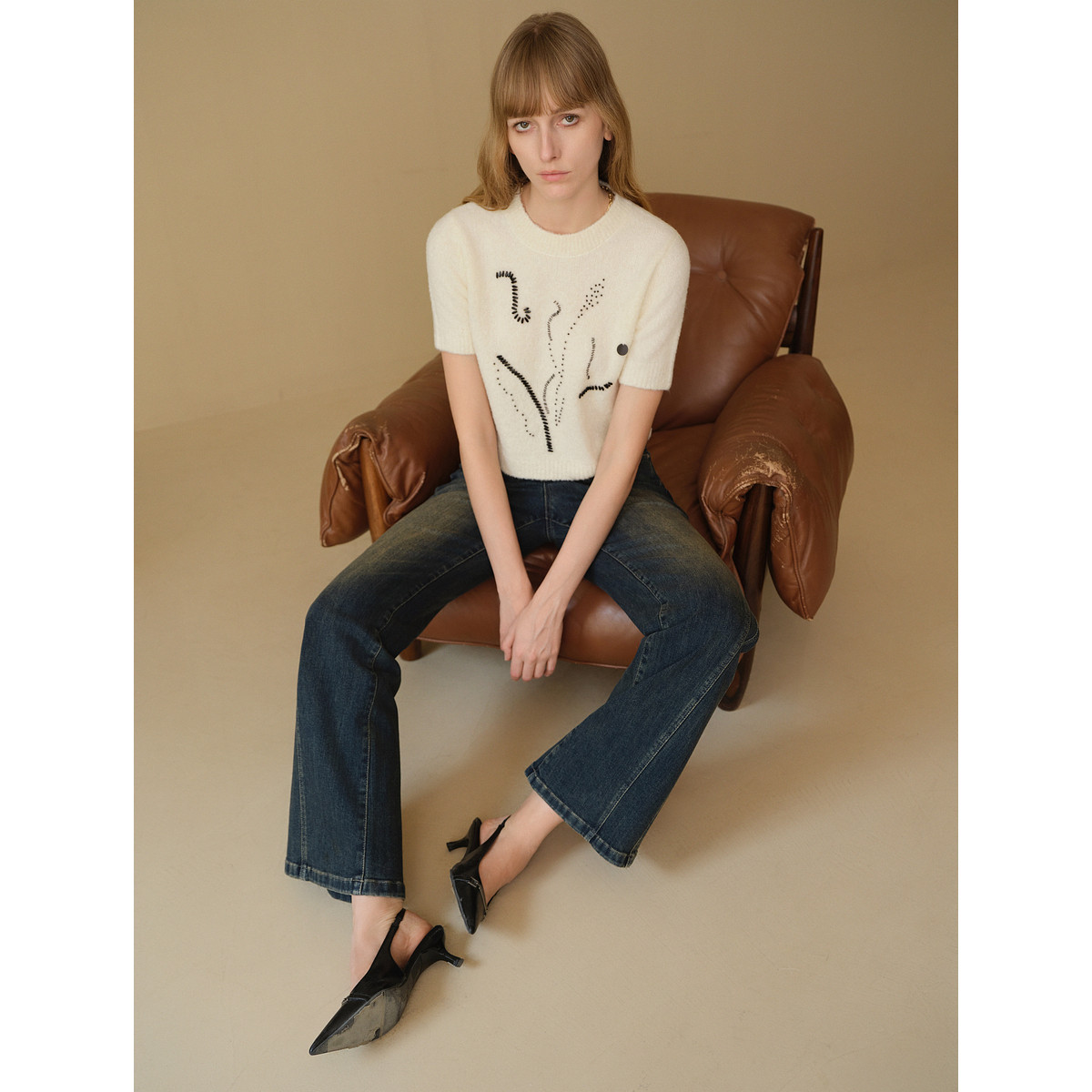 【商场同款】ELLE白色绵羊毛圆领毛针织衫女2025冬装新款短袖毛衣