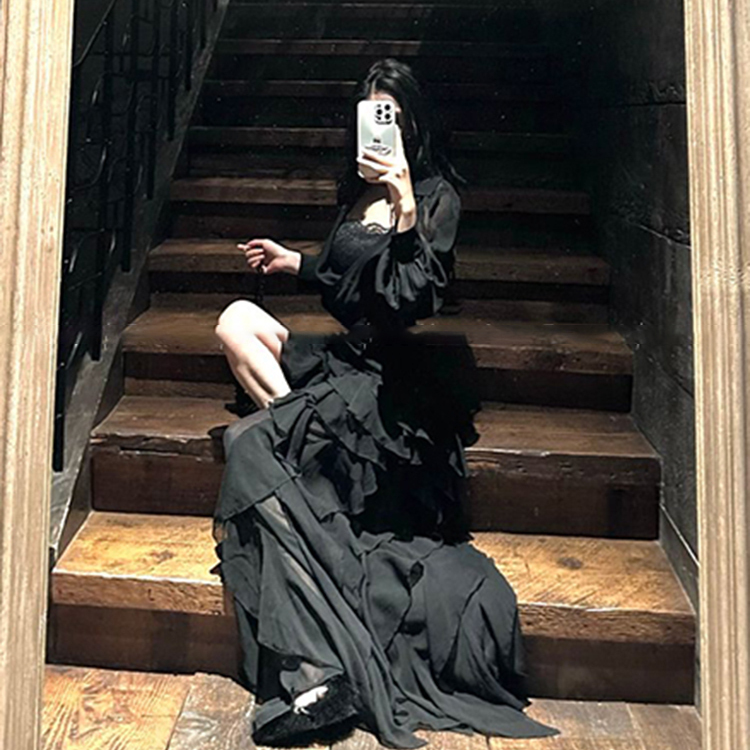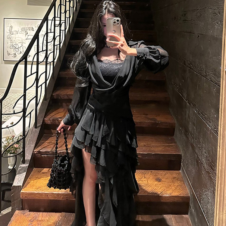 秋季新款纯欲风黑色套装裙女长袖衬衫蕾丝吊带不规则半身裙三件套