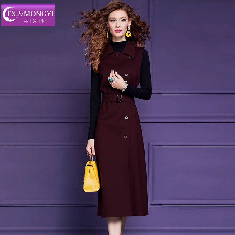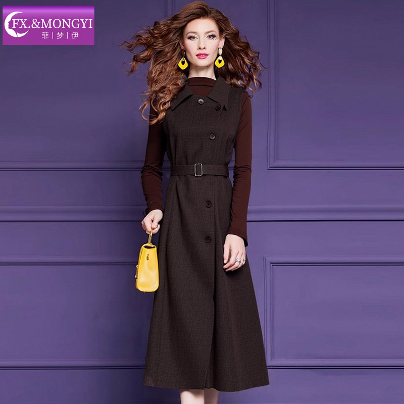 菲梦伊时髦省心搭配套装女秋季复古半高领打底衫T恤配背心连衣裙