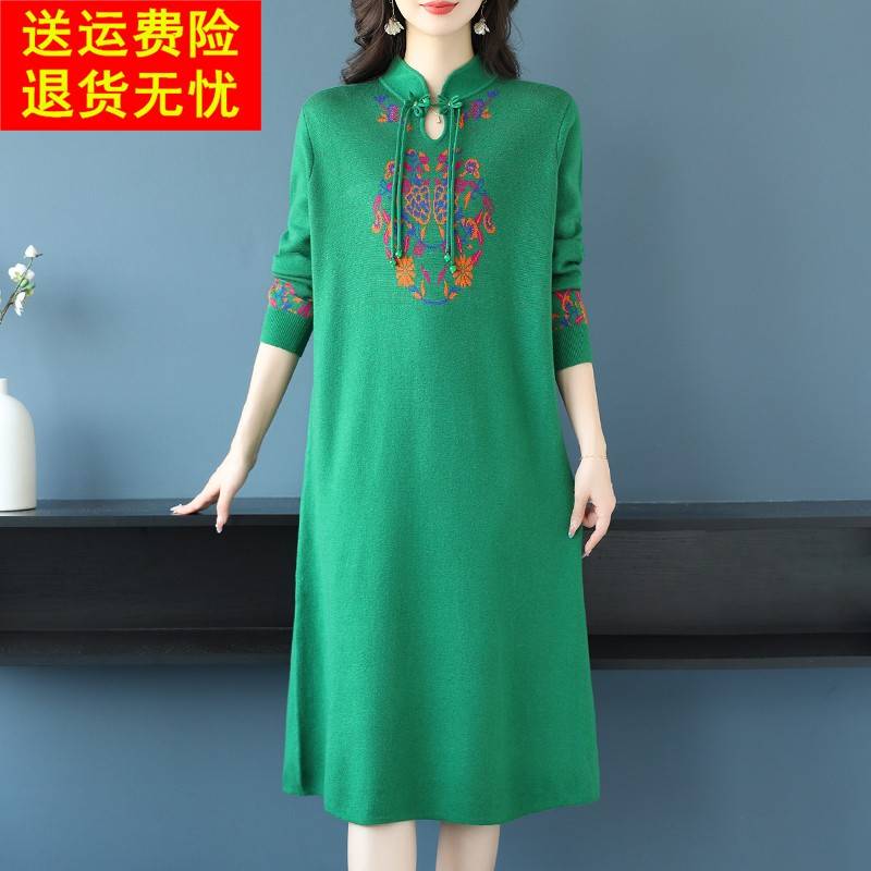 新中式大码女装针织改良旗袍裙子宽松盘扣中长款妈妈装羊绒毛衣裙