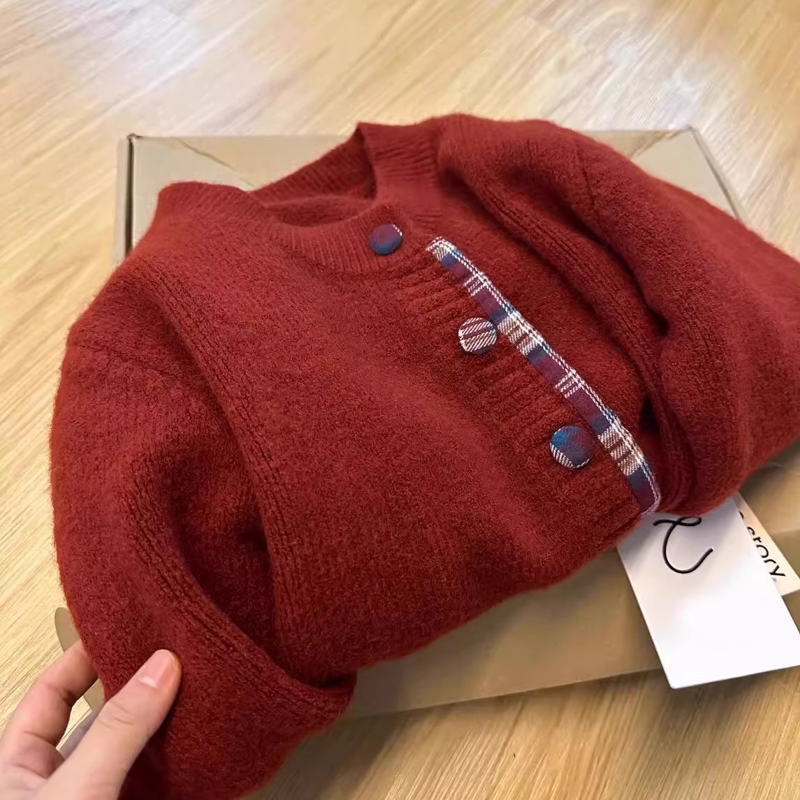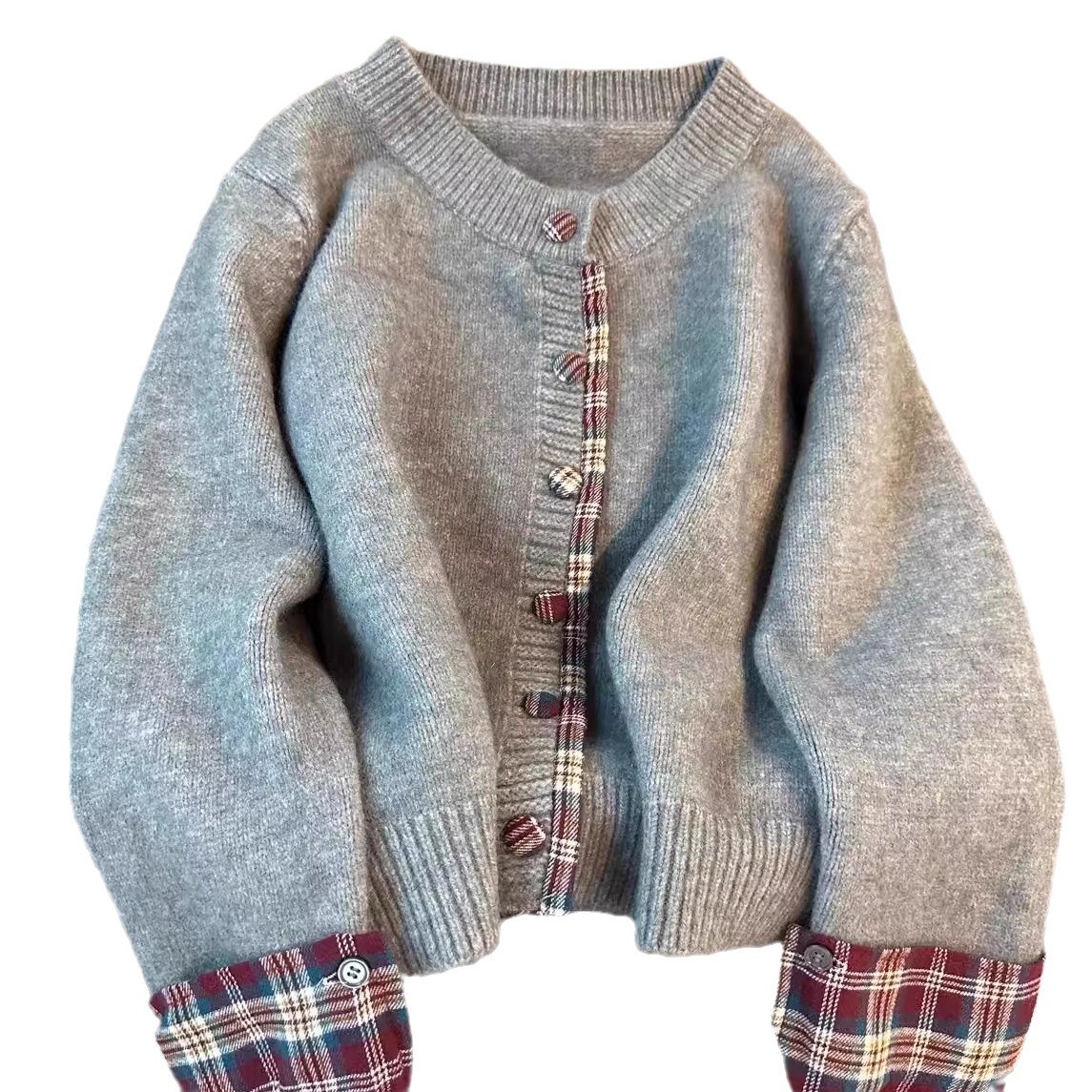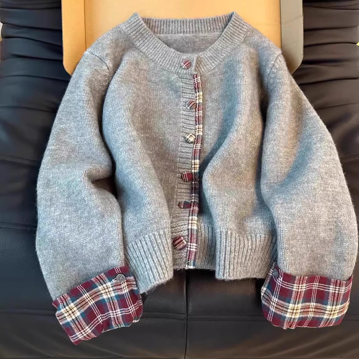 假两件韩系圆领拼接格子毛衣女2024秋冬新款针织外套宽松休闲开衫