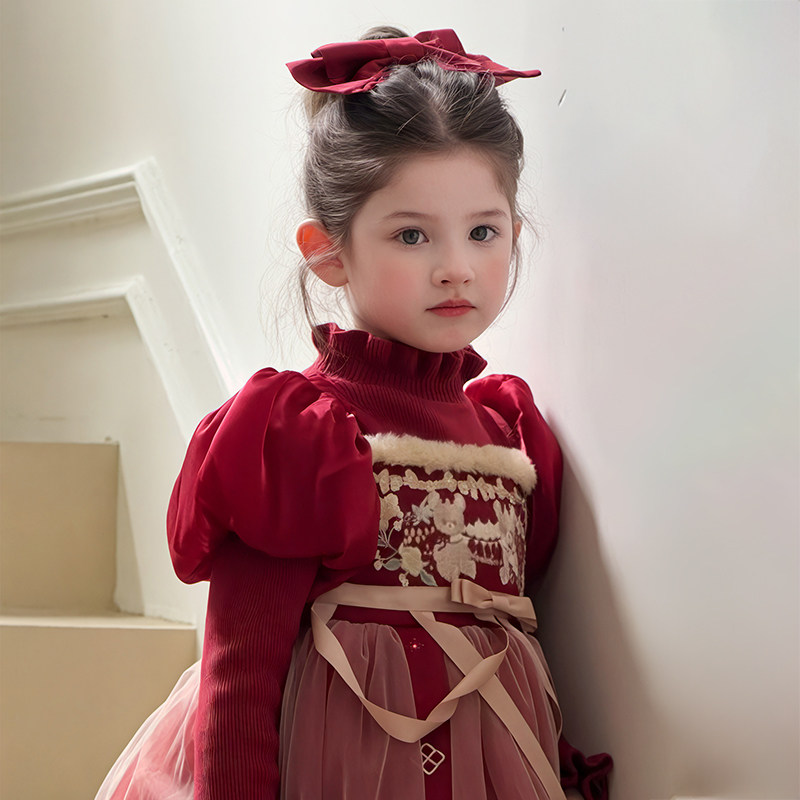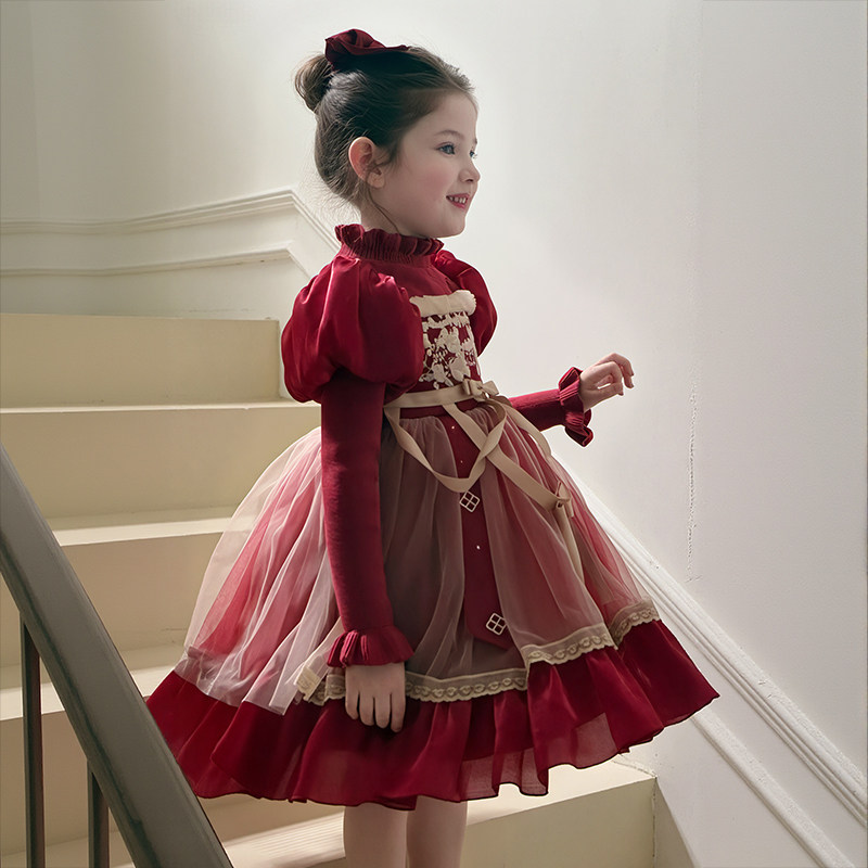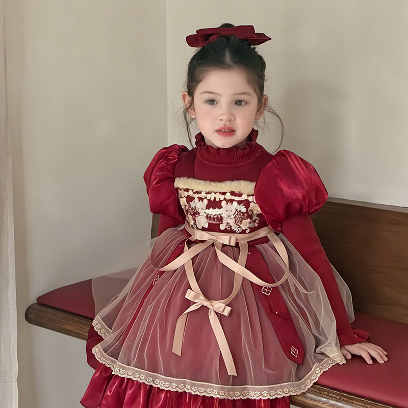 新年战袍女童红色洛丽塔公主裙秋冬连衣裙圣诞元旦礼服高端拜年服