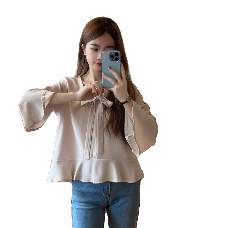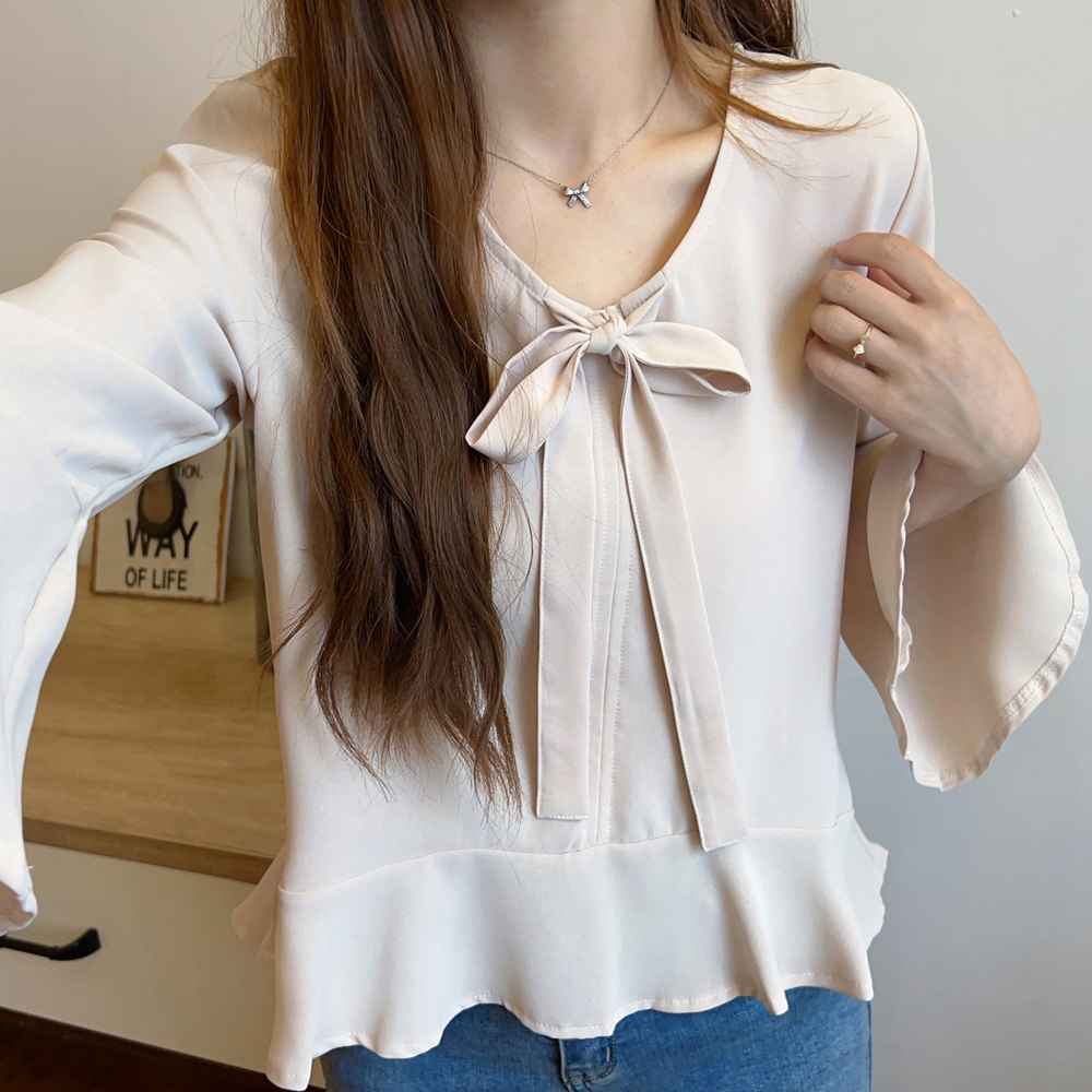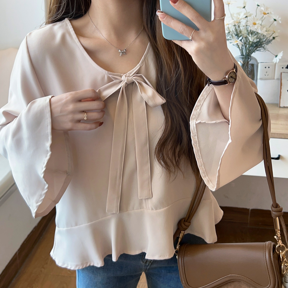 150小个子甜美纯色雪纺喇叭袖收腰圆领系带短款上衣女装春夏