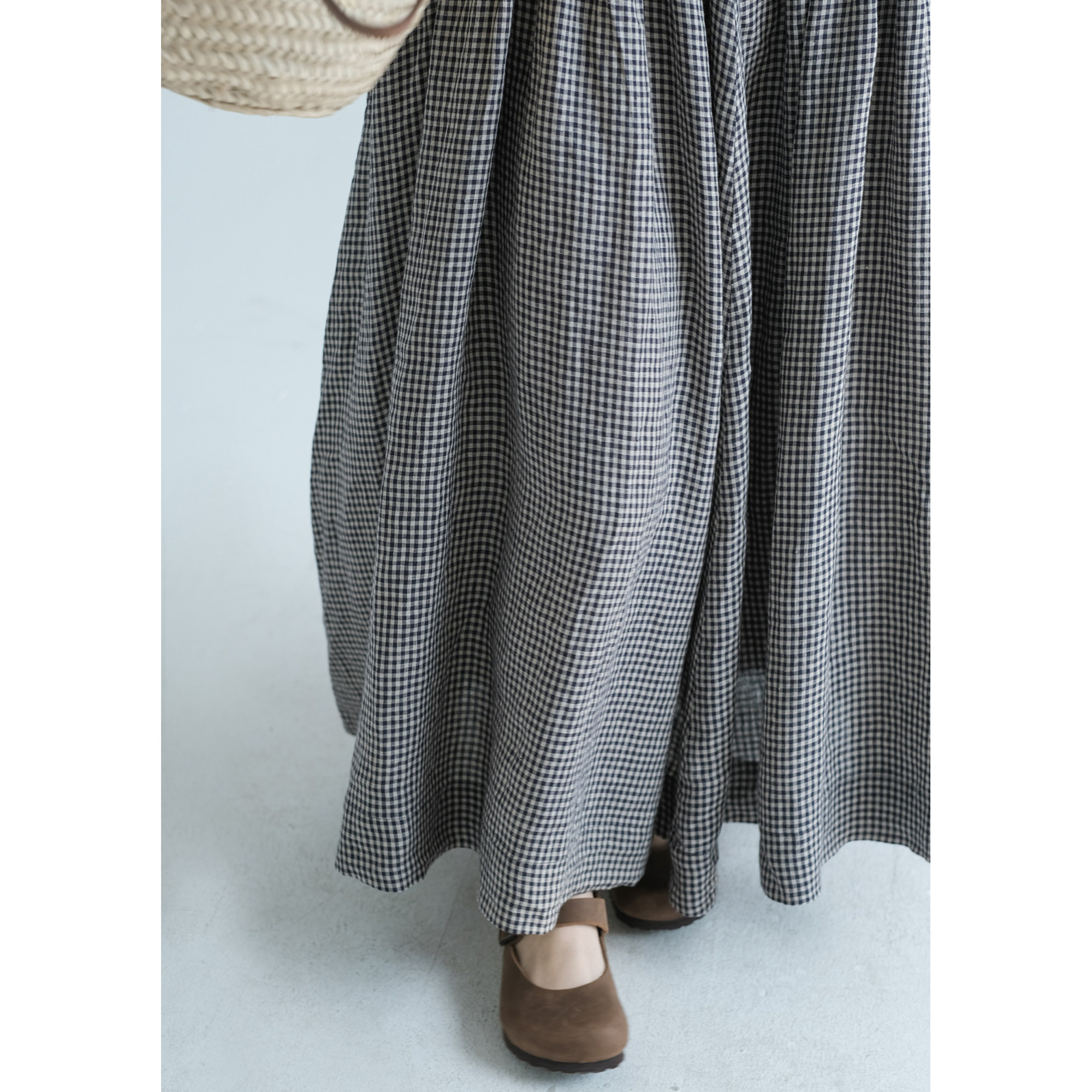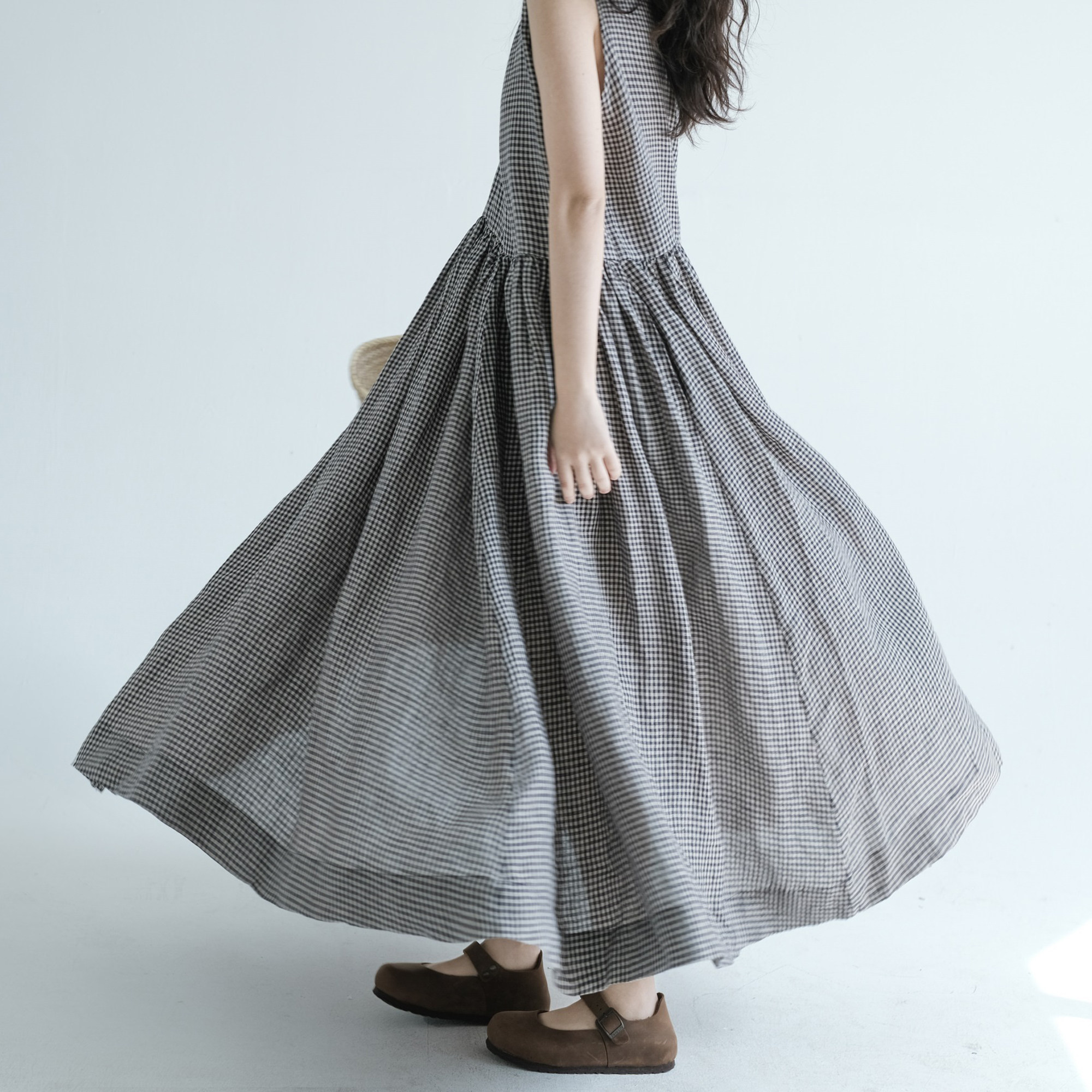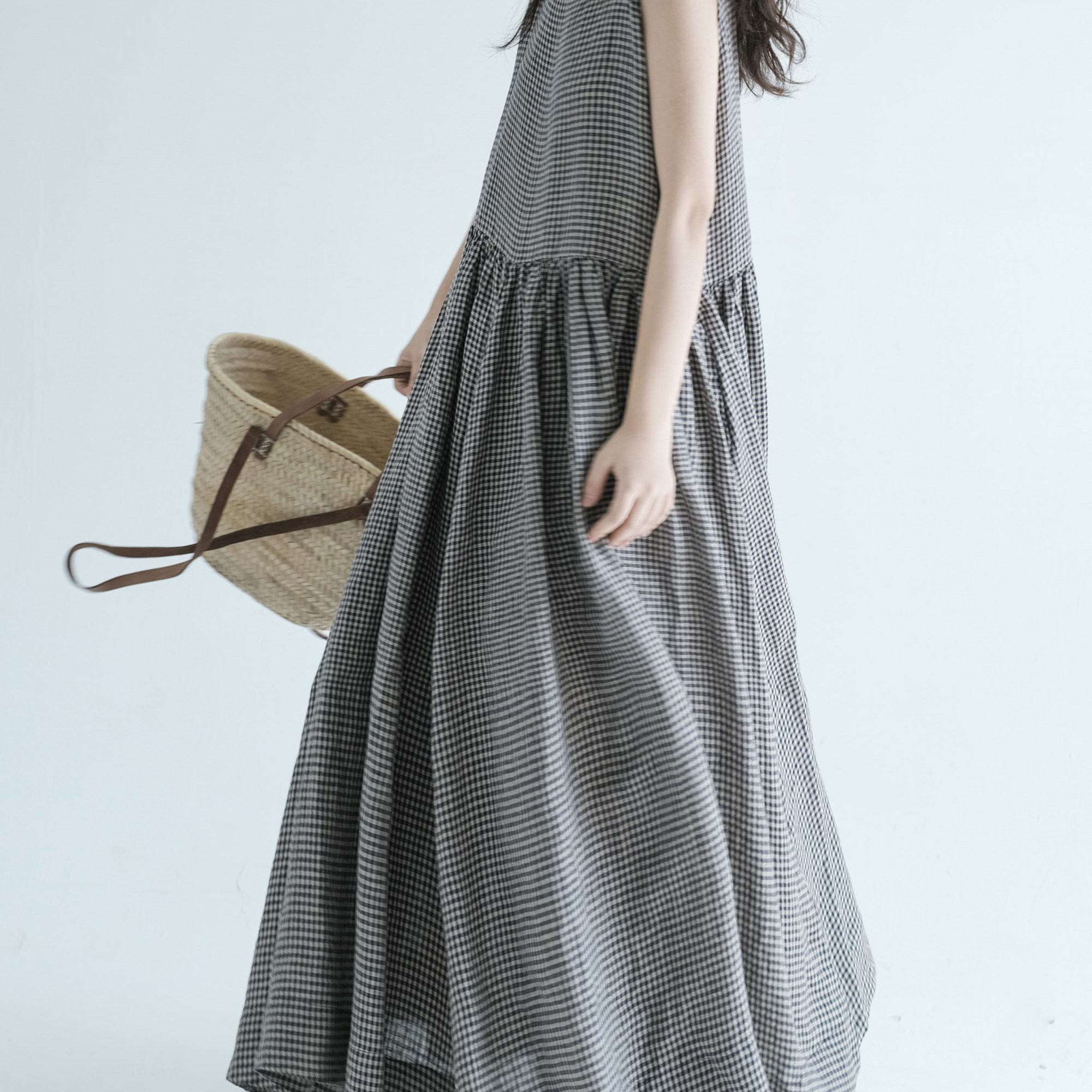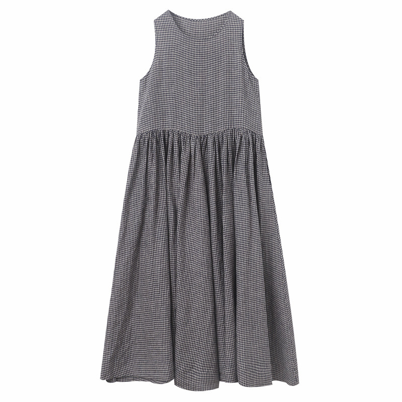 复述色织亚麻超大摆宽松无袖背心裙 新款舒爽透气格子连衣裙