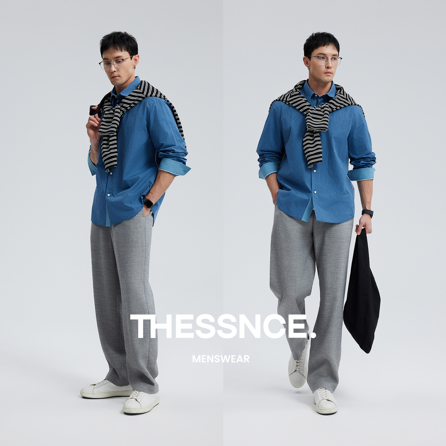 THESSNCE 色织提花维希格镶边子母带拼接衬衫夏季宽松休闲外套男