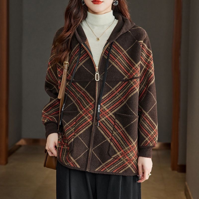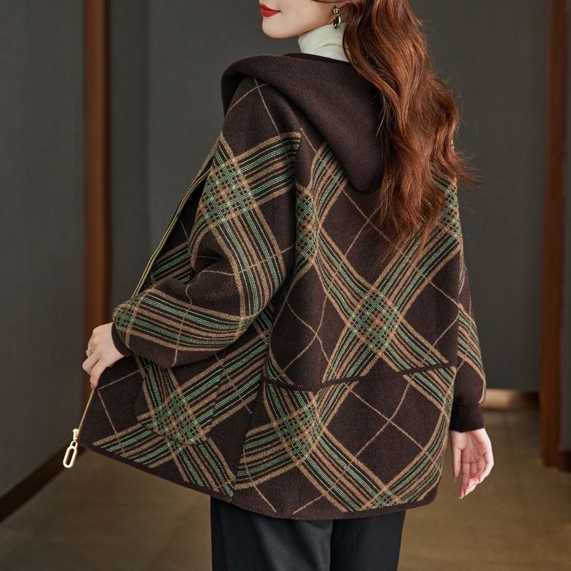 秋冬连帽格子仿双面毛呢外套女宽松大码显瘦百搭减龄年轻妈妈大衣