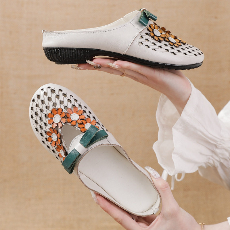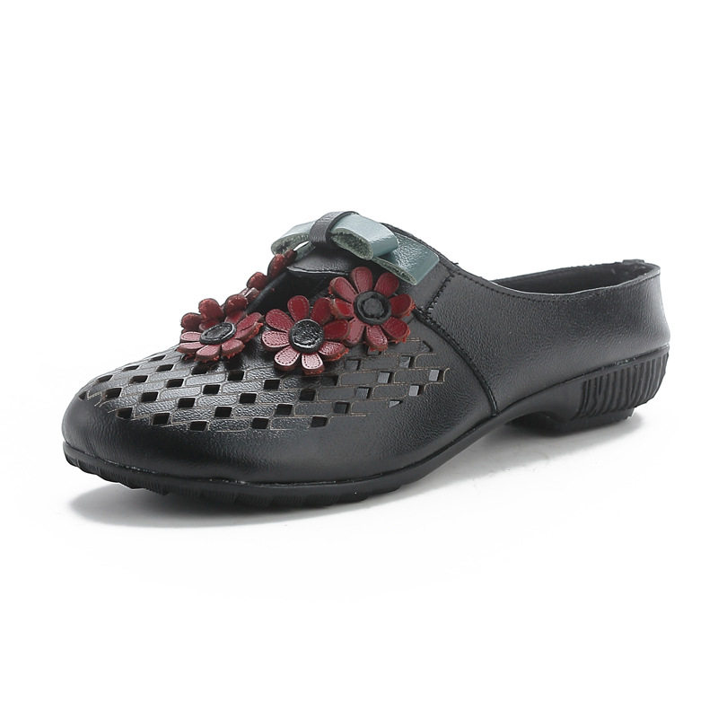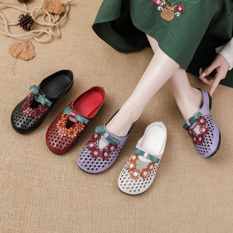 夏季新款复古民族风女鞋真皮镂空透气平底拖鞋包头中老年妈妈凉鞋