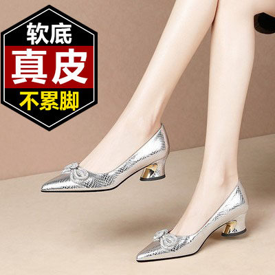 舒适软皮尖头中跟单鞋女真皮2025年新款粗跟水钻蝴蝶结浅口高跟鞋