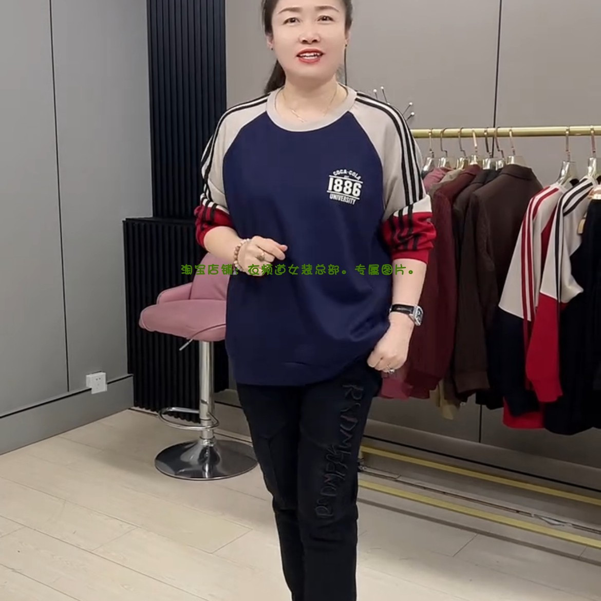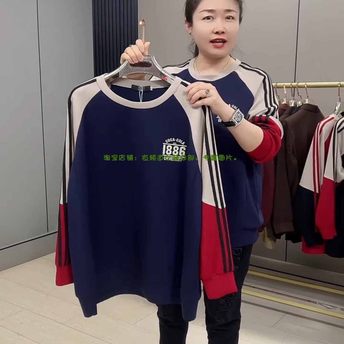 2025春季新款加肥加大减龄显瘦胖妹妹上衣圆领拼色长袖套头卫衣女
