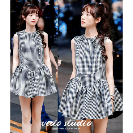 田曦薇同款格子无袖连衣裙女夏季显瘦小个子娃娃蓬蓬裙可爱风短裙