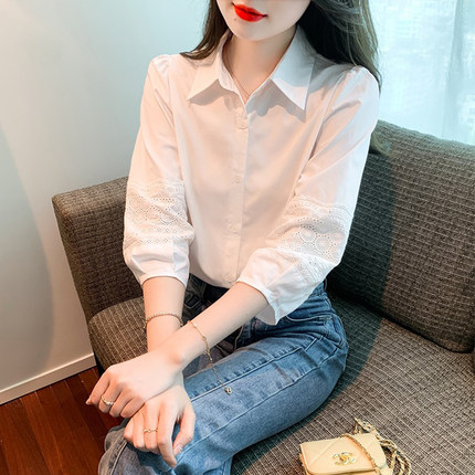 七分袖白色衬衫女夏装2025年新款刺绣镂空灯笼袖职业衬衣法式上衣