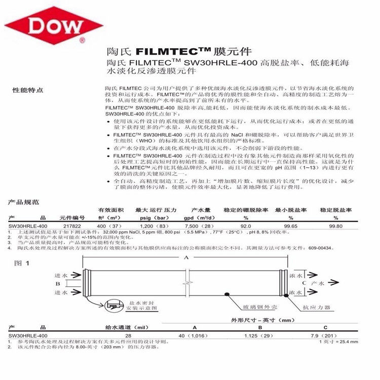 DOW陶氏杜邦SW30HRLE-400船舶饮用水海水淡化纯水机RO膜现货包邮