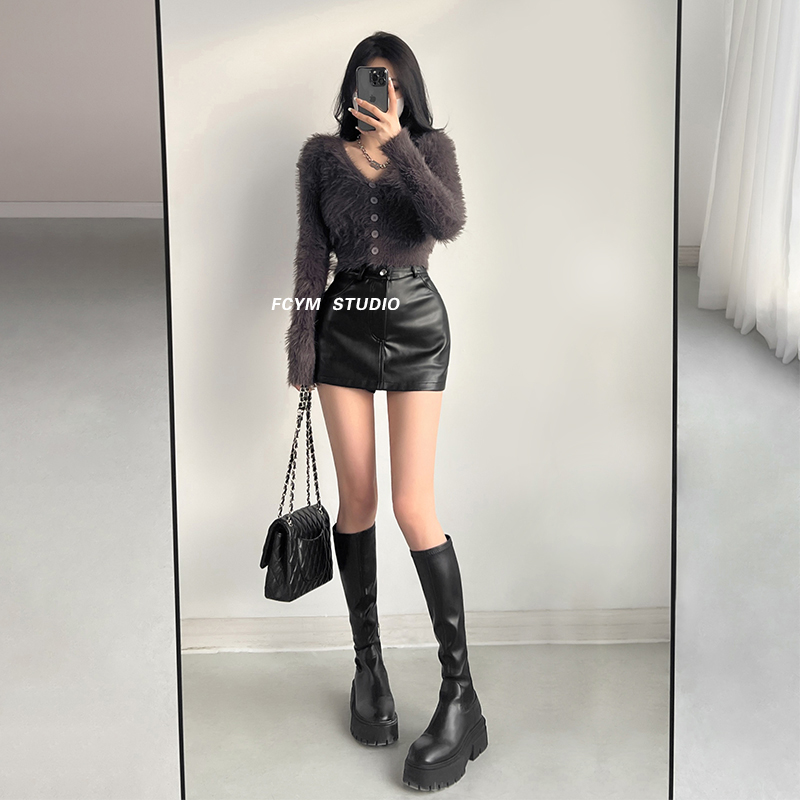 风车与矛 黑色包臀小皮裙女春款性感小黑裙高腰a字短裙半身裙